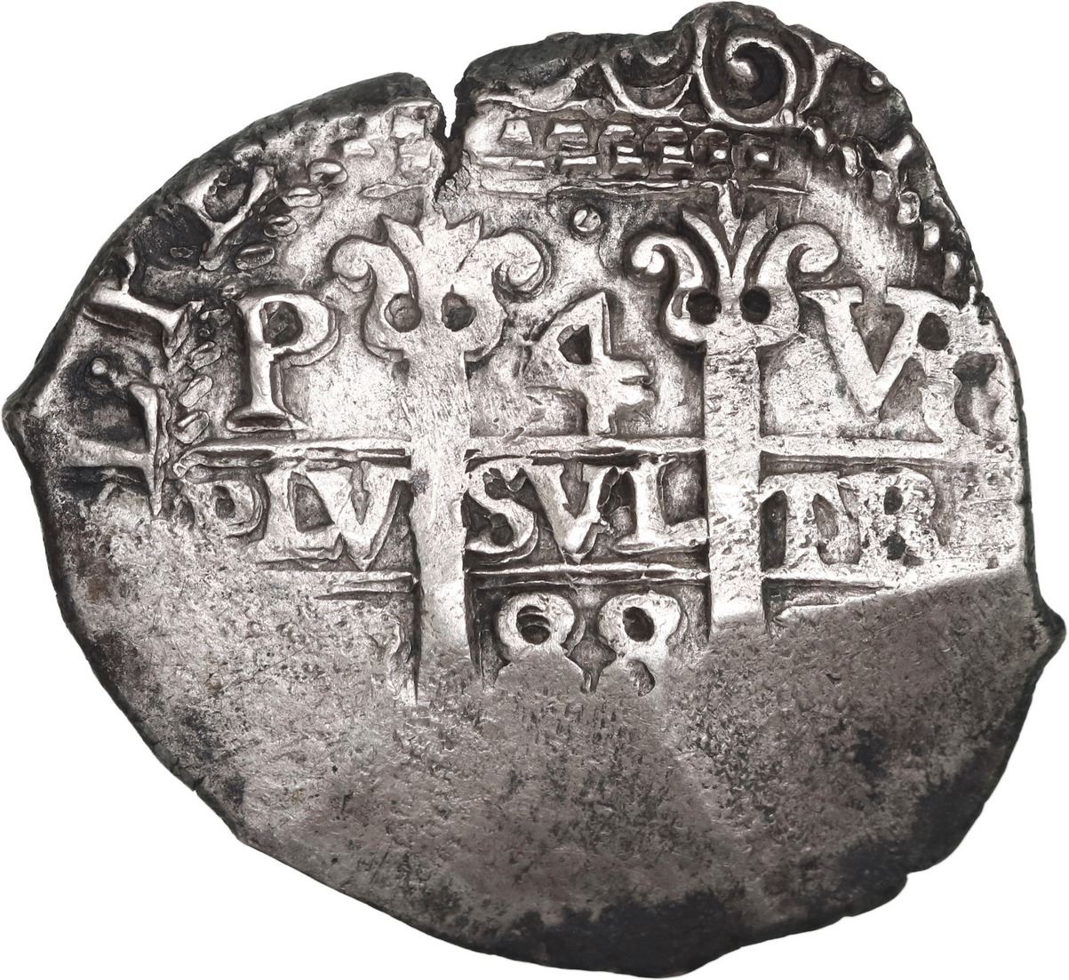 BOLIVIA, Potosí, cob 4 reales, 1688 VR, ex-Ponte. S-P40; KM-25; Cal-535. 13.22 grams. Full and bold CAROLVS II outside of doubled cross, full and well-centered pillars with flat areas at bottom two dates and assayers, VF with some spots of black oxidation. Pedigreed to the Luis R. Ponte Collection.