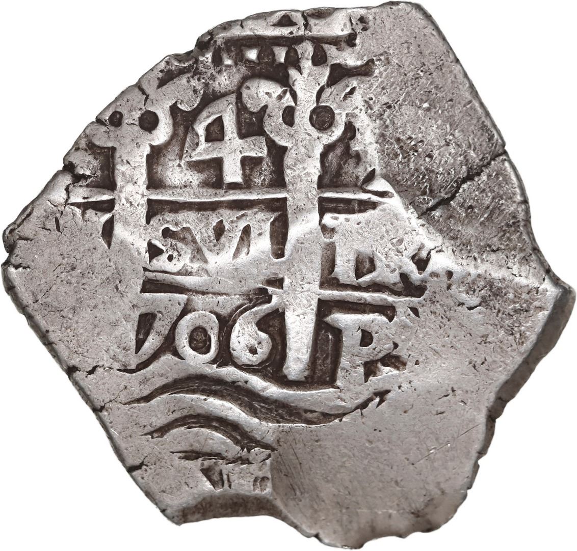 BOLIVIA, Potosí, cob 4 reales, 1706 Y, ex-Ponte. S-P43a; KM-30; Cal-1158. 12.64 grams. Odd-shaped flan with flat peripheries, full pillars-and-waves with bold date nonetheless, doubled and off-center cross, Fine with contrasting toning in crevices, small part of edge slightly bent. Pedigreed to the Luis R. Ponte Collection.