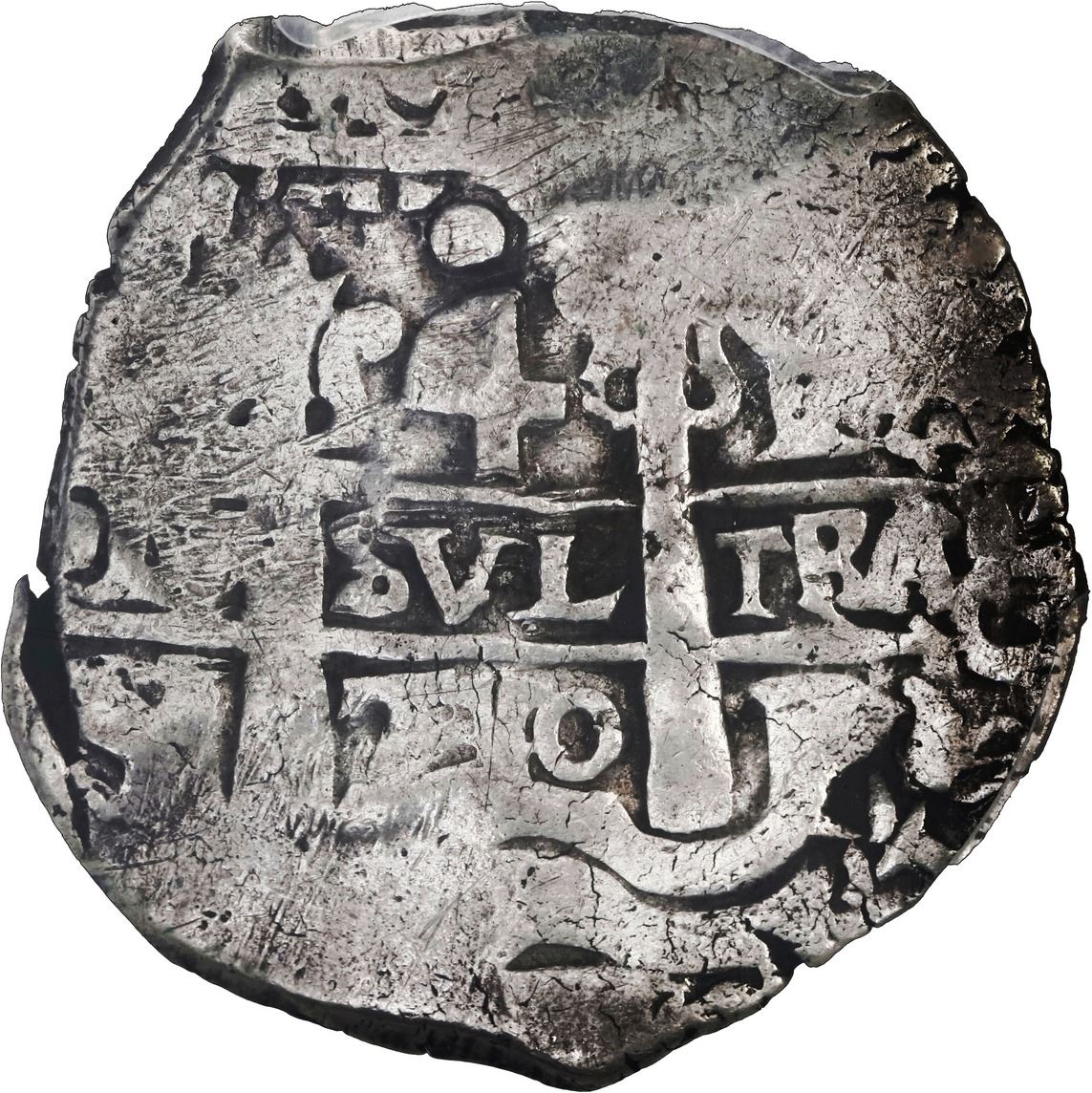 BOLIVIA, Potosí, cob 4 reales, 1710 Y, rare, PCGS VF30, ex-Pat Johnson, ex-Karon. S-P43a; KM-30; Cal-1162. 13.4 grams. Full pillars and cross with much crude flatness but two dates and three assayers nonetheless, toned on fields, first example of this date in this denomination we have ever auctioned. Pedigreed to the Pat Johnson and the Paul Karon Collections (both stated on label) and to the Ponterio auction of March 1990, with original lot-tag 395.