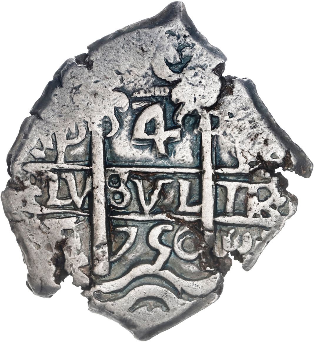 BOLIVIA, Potosí, cob 4 reales, 1750 E/q, ex-Ponte. S-P51; KM-39; Cal-402. 13.46 grams. Squarish flan with ragged edge (as made), choice full pillars-and-waves, slightly off-center full cross-lions-castles, two bold dates and assayers (both with E/q), richly toned AU with beautiful blue luster in crevices. Pedigreed to the Luis R. Ponte Collection.
