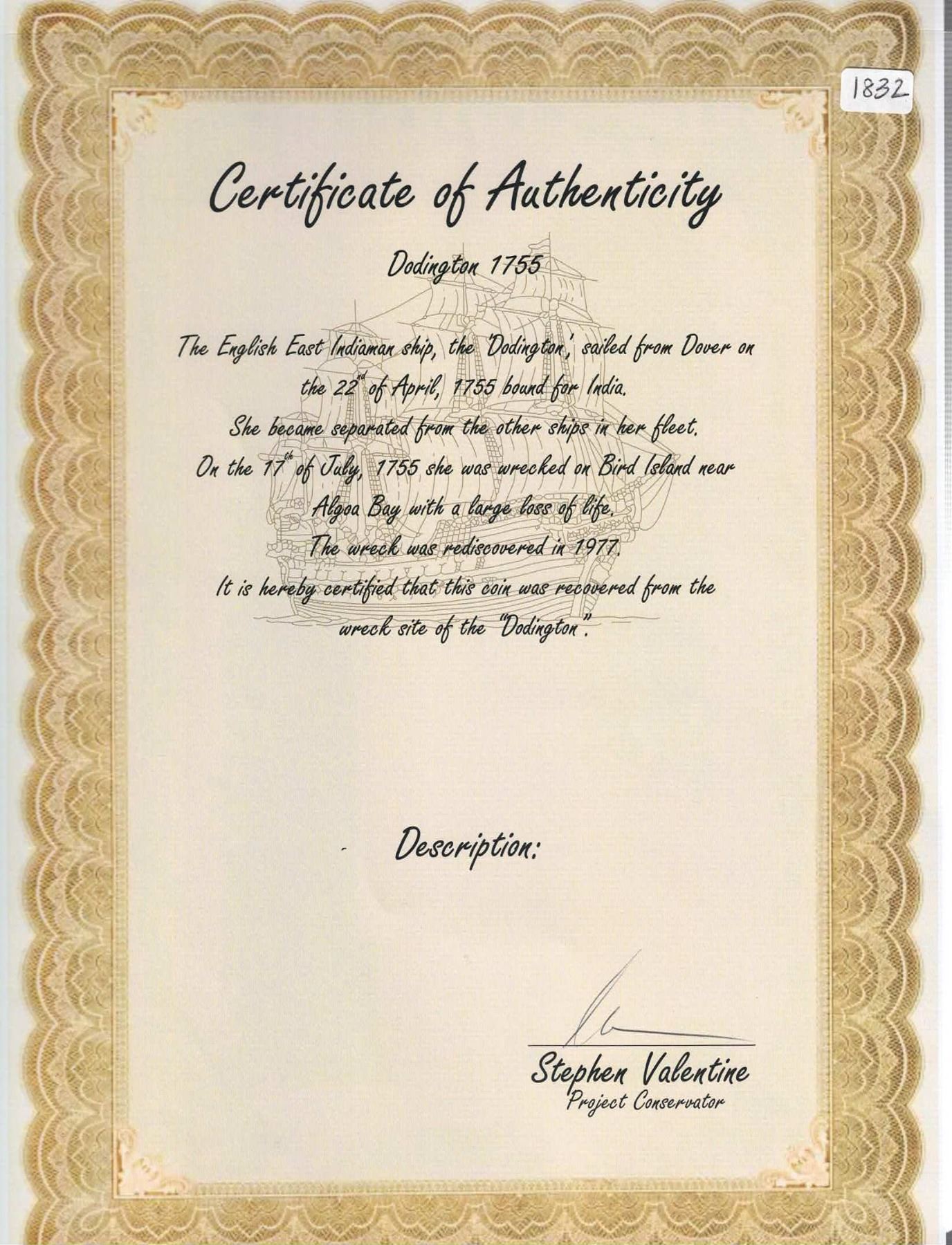 BOLIVIA, Potosí, cob 4 reales, 1752 q. S-P52; KM-39; Cal-406. 7.56 grams. Heavily corroded and smooth pillars side yet with a decent cross showing visible date below. With original certificate from the salvor/conservator. Recovered from: Dodington, sunk in 1755 off South Africa