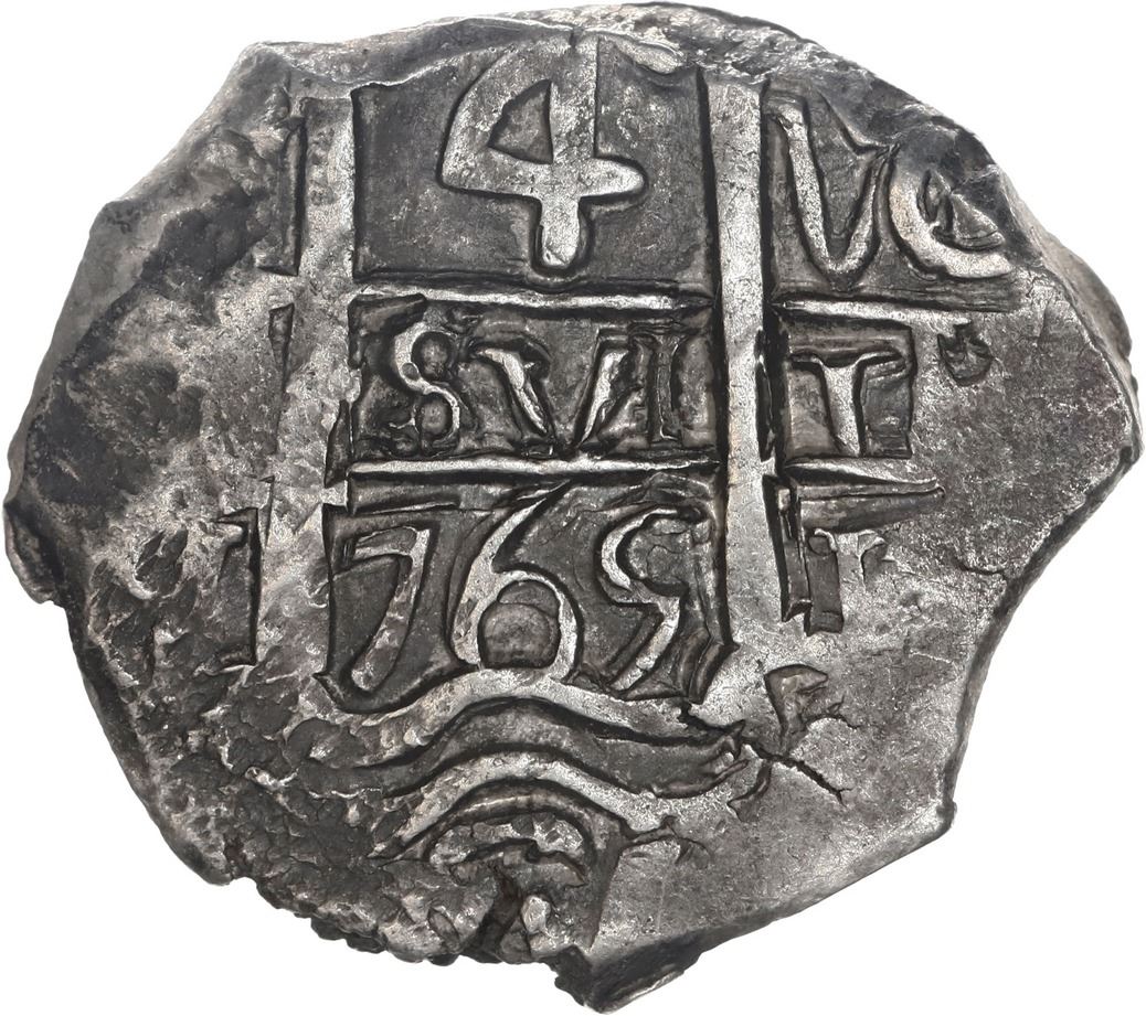 BOLIVIA, Potosí, cob 4 reales, 1765 V-Y, ex-Ponte. S-P57; KM-44; Cal-909. 13.38 grams. Chunky XF+ with bold full pillars-and-waves, nearly full cross-lions-castles (off-center), two full dates, unevenly toned. Pedigreed to the Luis R. Ponte Collection.