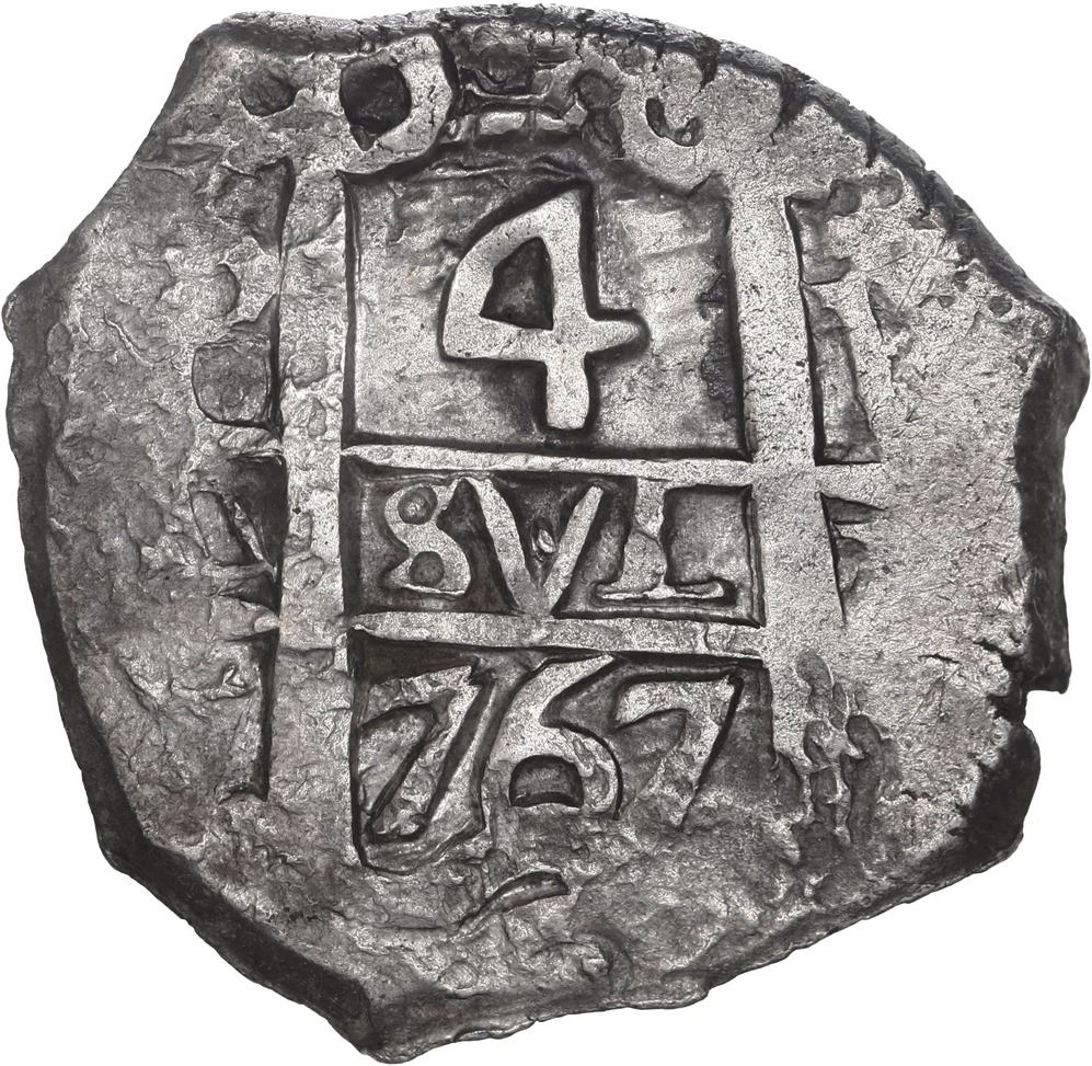 BOLIVIA, Potosí, cob 4 reales, 1767 V-Y, ex-Ponte. S-P57; KM-44; Cal-911. 13.50 grams. Chunky flan with well-centered full pillars, bold but off-center cross, two full dates, lightly toned XF+ with slight surface roughness on opposing sides (as made). Pedigreed to the Luis R. Ponte Collection.