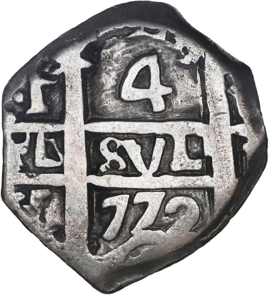 BOLIVIA, Potosí, cob 4 reales, 1772 V-Y-V, ex-Ponte. S-P59; KM-44; Cal-918. 13.19 grams. Well-circulated, chunky Fine piece with clear date between pillars and second date below off-center cross, rich dark gray toning all over. Pedigreed to the Luis R. Ponte Collection.