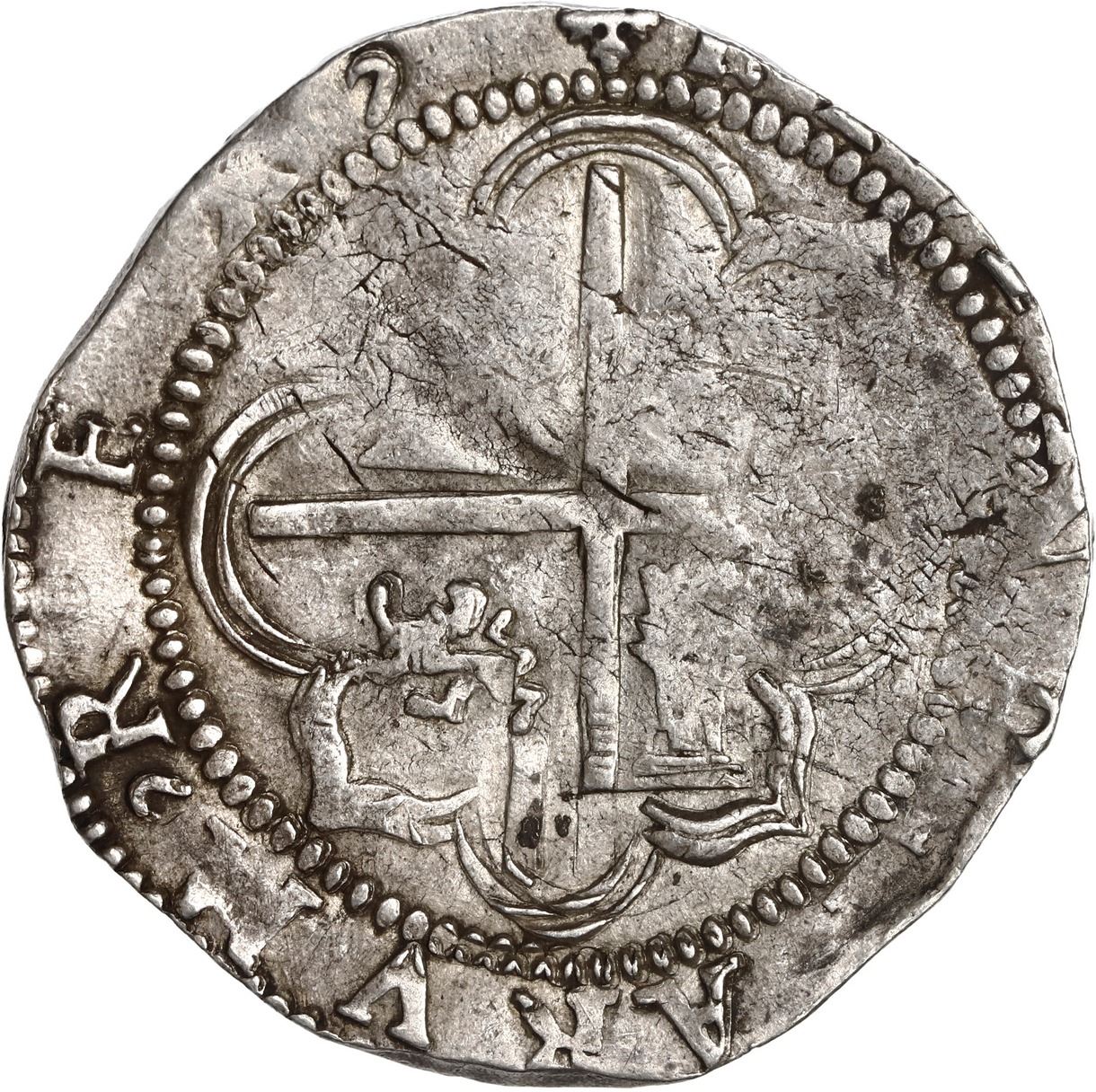 BOLIVIA, Potosí, cob 4 reales, Philip II, assayer B (1st period). S-P4; KM-4.2; Cal-525. 13.58 grams. Fairly well-struck XF though on a crude planchet with significant interior cracking, nearly complete shield and cross, clear mintmark and assayer, almost all of the legends showing, somewhat lustrous with faint golden toning.