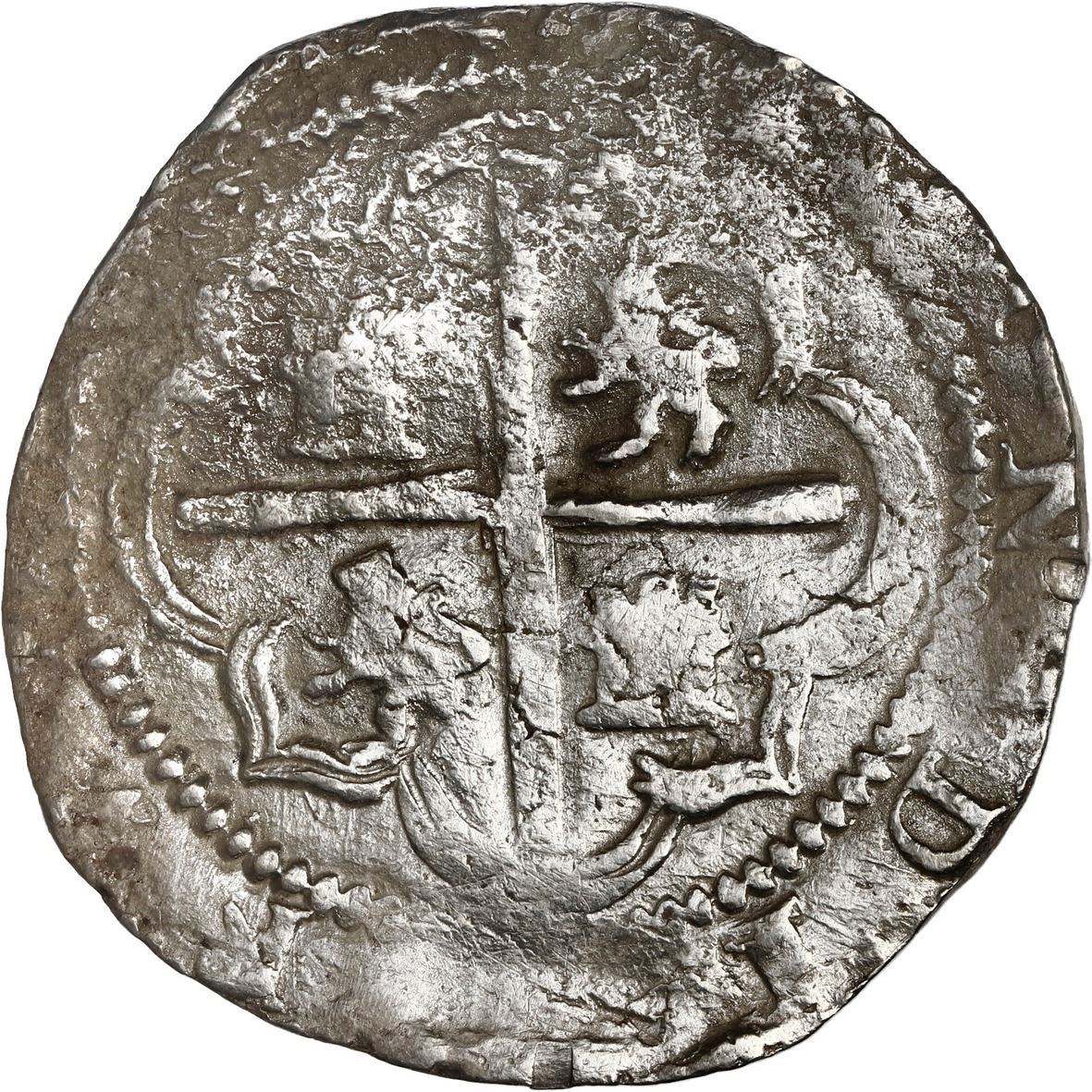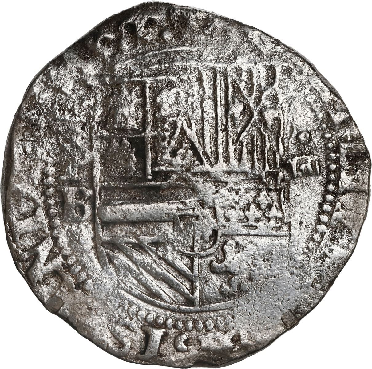 BOLIVIA, Potosí, cob 4 reales, Philip II, assayer B (1st period). S-P4; KM-4.2; Cal-525. 12.69 grams. VF with silvery, slightly corroded surfaces from unspecified salvage, bold assayer and full shield, complete cross, fair amount of the legends showing too.