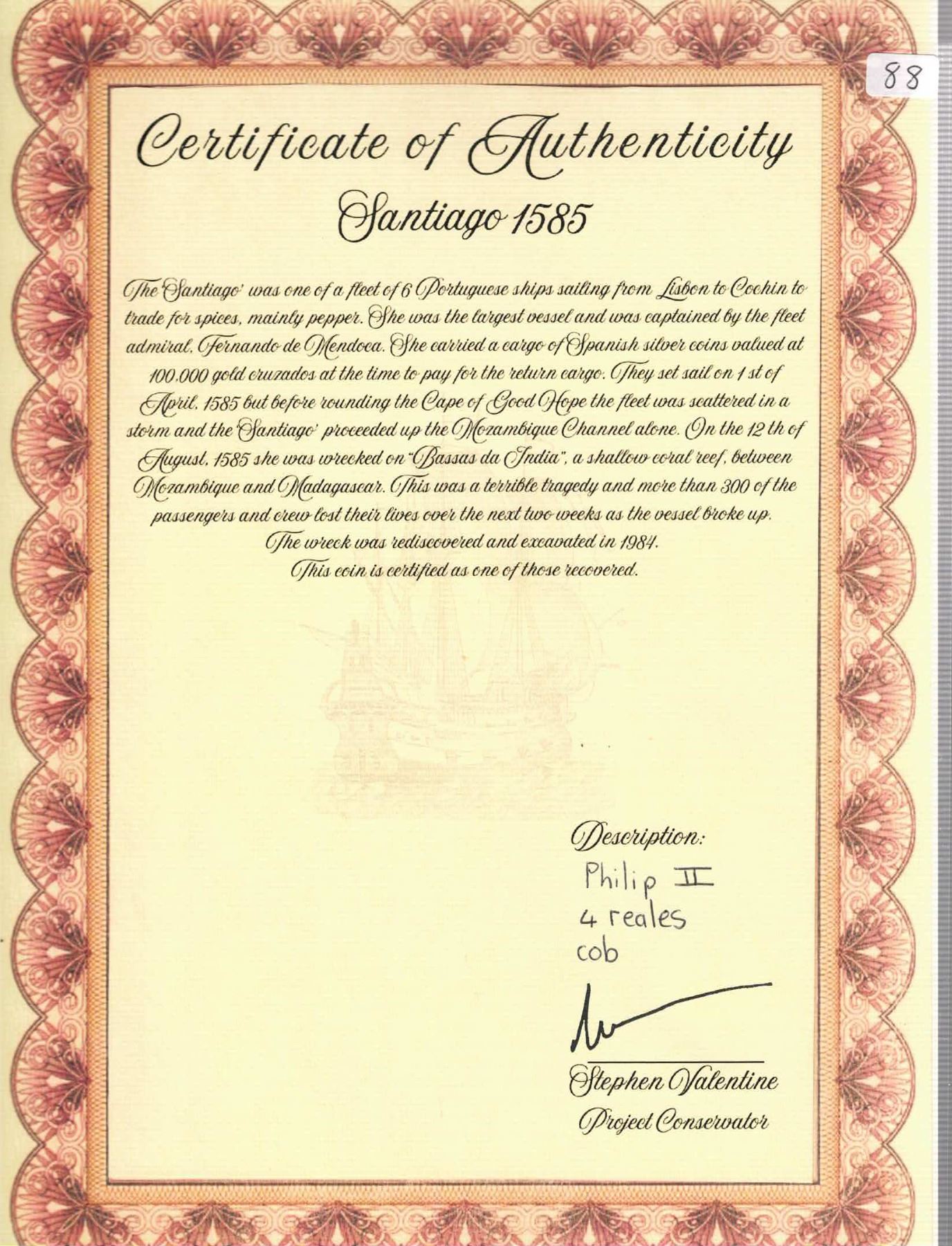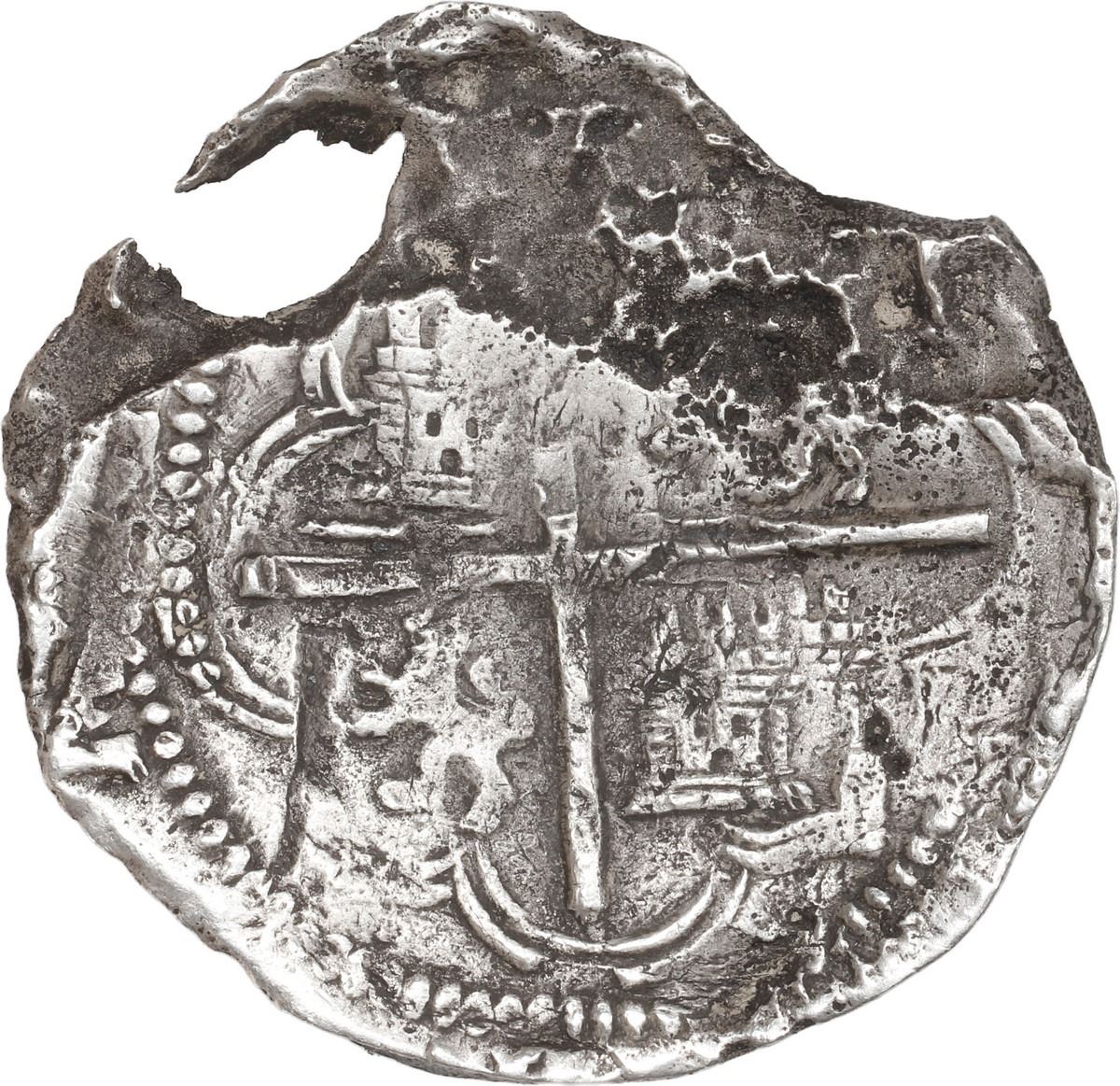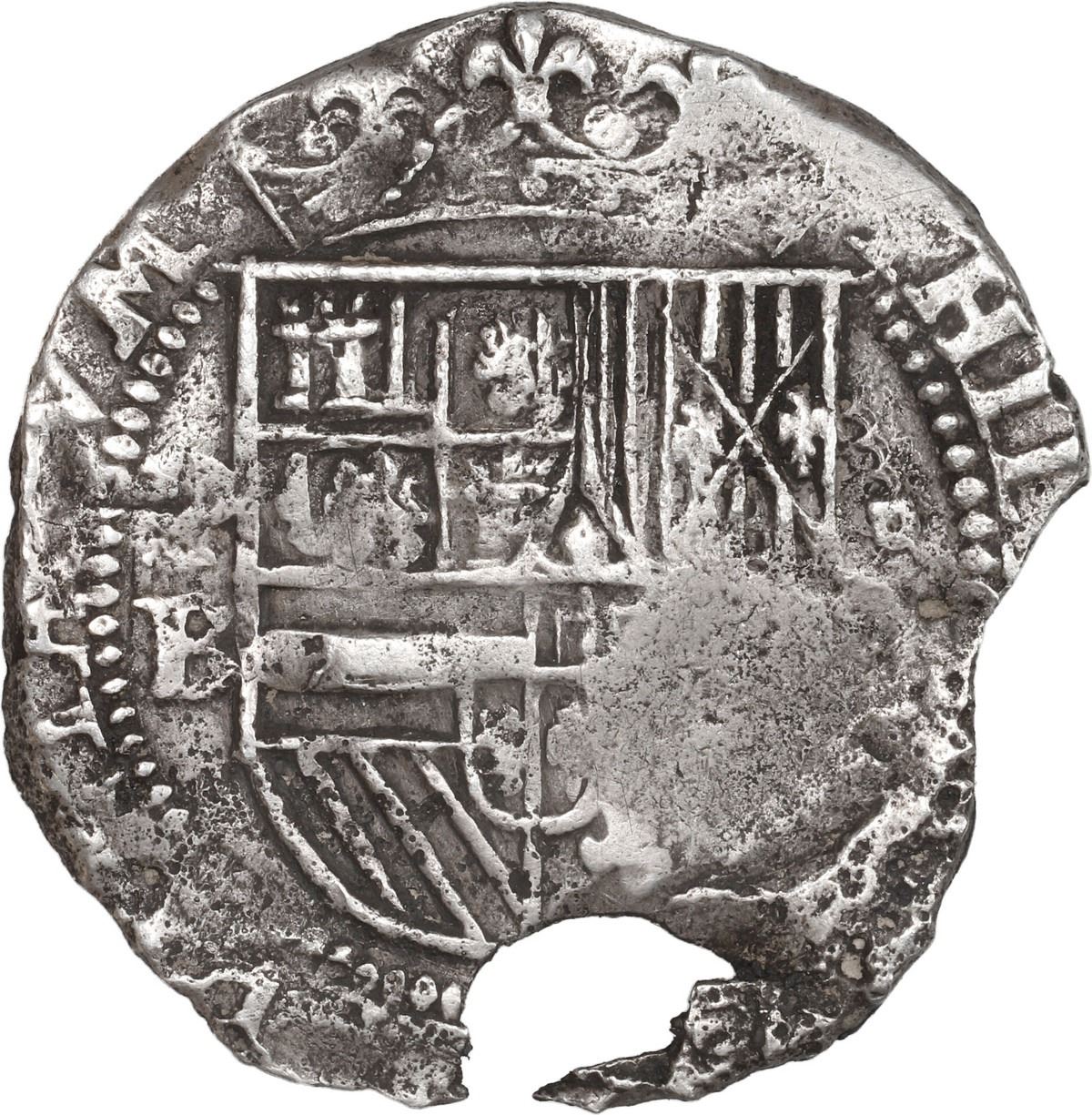 BOLIVIA, Potosí, cob 4 reales, Philip II, assayer B (1st period). S-P4; KM-4.2; Cal-525. 10.42 grams. Sharply detailed per the type, with nearly full shield and cross despite some heavy peripheral corrosion and edge-loss, nice toning throughout. Pedigreed to the Steve Valentine Collection, with original certificate from the salvor/conservator. Recovered from: Santiago, sunk in 1585 off Bassas da India in the Indian Ocean