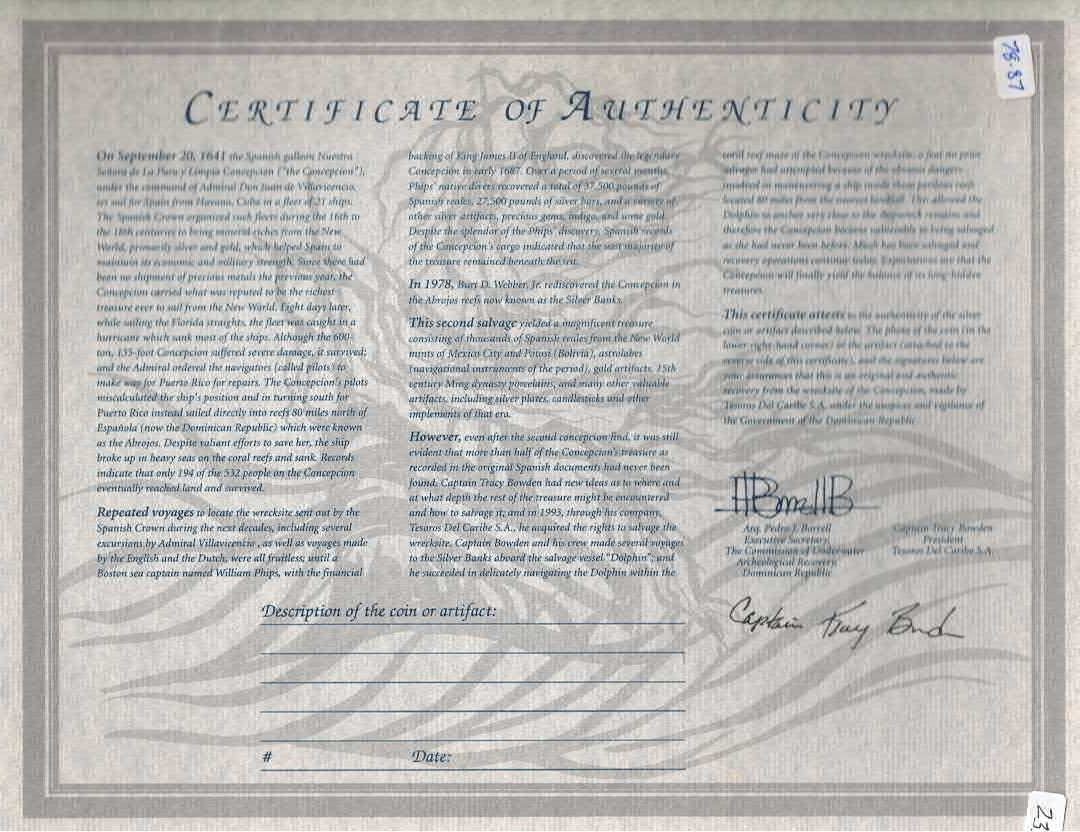 BOLIVIA, Potosí, cob 4 reales, Philip III, assayer M (pre-dated type), quadrants of cross transposed. S-P18; KM-unl (9 for type); Cal-unl (Type 148). 11.90 grams. Good full shield and (slightly off-center) cross, full mintmark with clear right side of assayer below, nicely toned, minimal surface corrosion. With original certificate from Captain Tracy Bowden through his contract with the Dominican Republic. Recovered from: Concepción, sunk in 1641 off Hispaniola