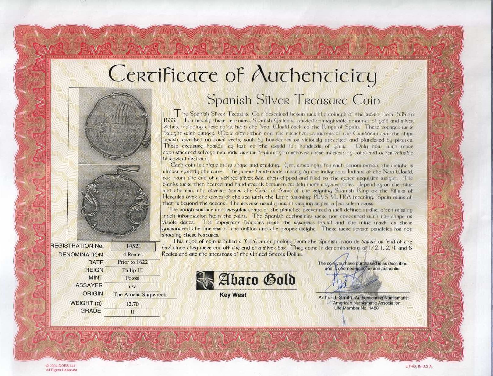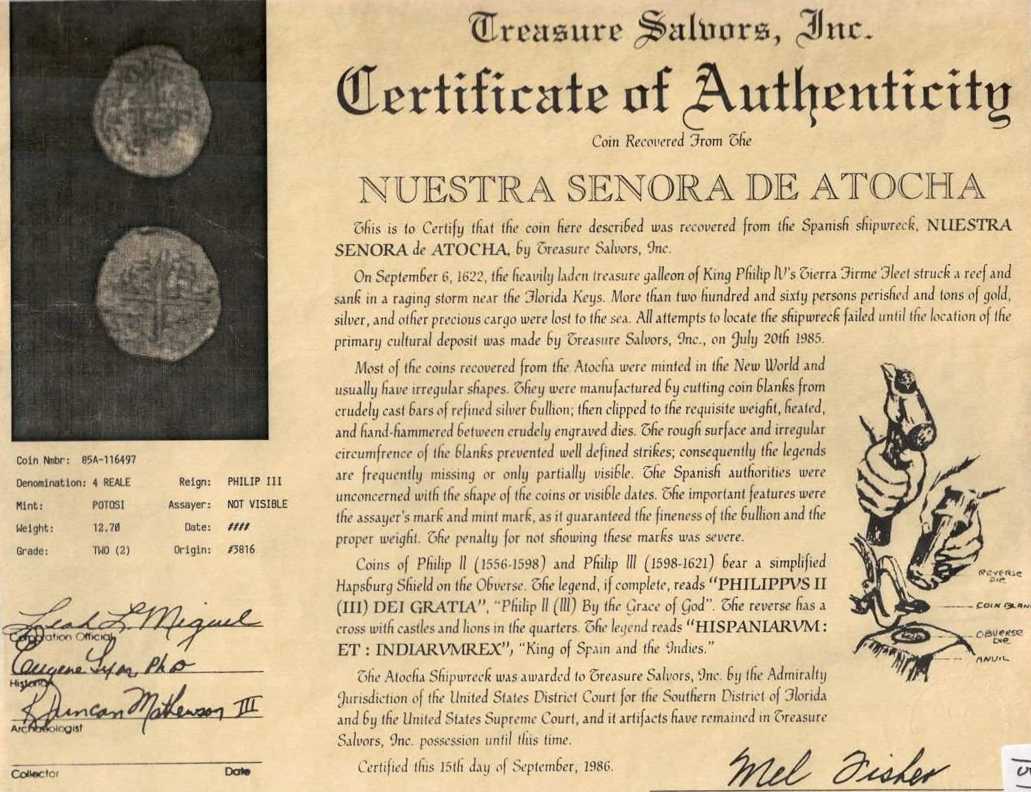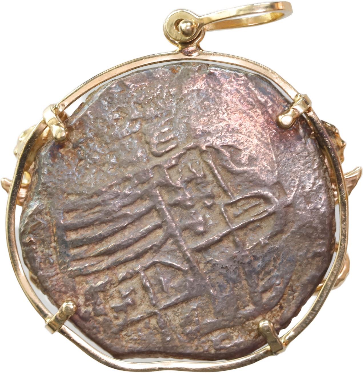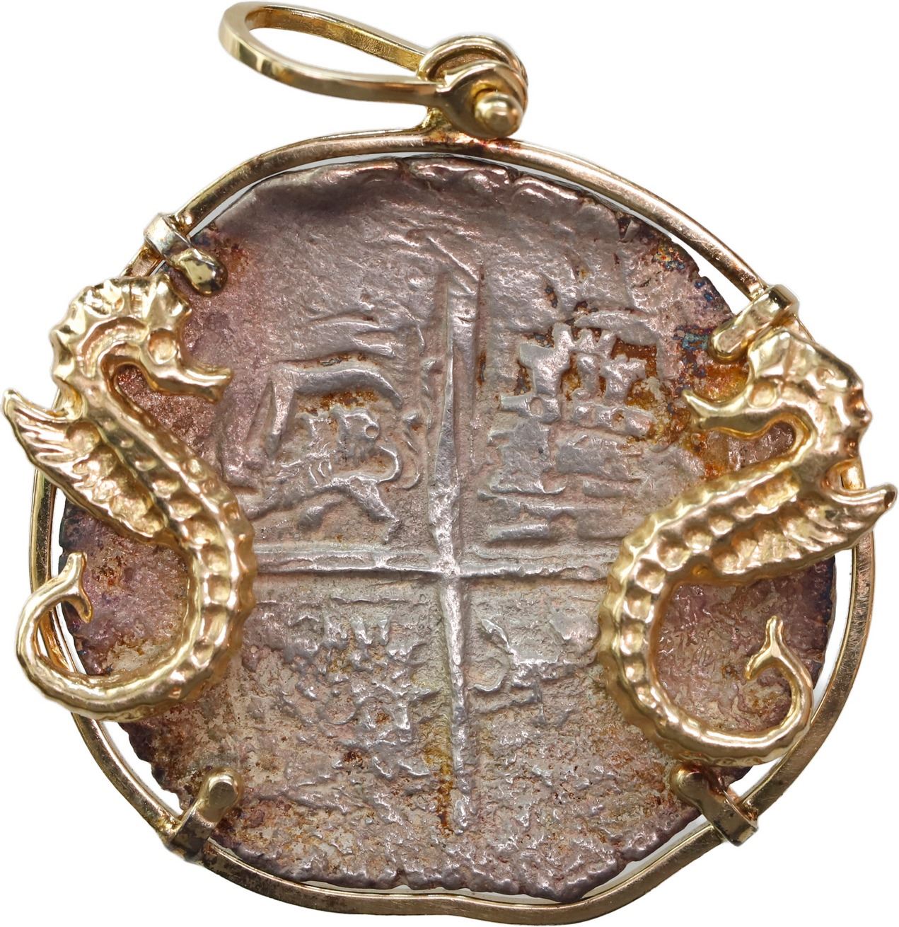 BOLIVIA, Potosí, cob 4 reales, Philip III, assayer T, quadrants of cross transposed, Grade 2, ex-Atocha (1622), mounted cross-side out in 14K gold pendant with seahorse embellishments and shackle bail. 18.42 grams total. Well-detailed, lightly corroded piece with full cross showing transposed lion and castle in top quadrants, nearly complete shield with a little doubling, assayer nearly off the flan yet certain, deep red and blue toning. From the Atocha (1622), with Fisher certificate 85A-116497 (trimmed, tag missing) and dealer photo-certificate.
