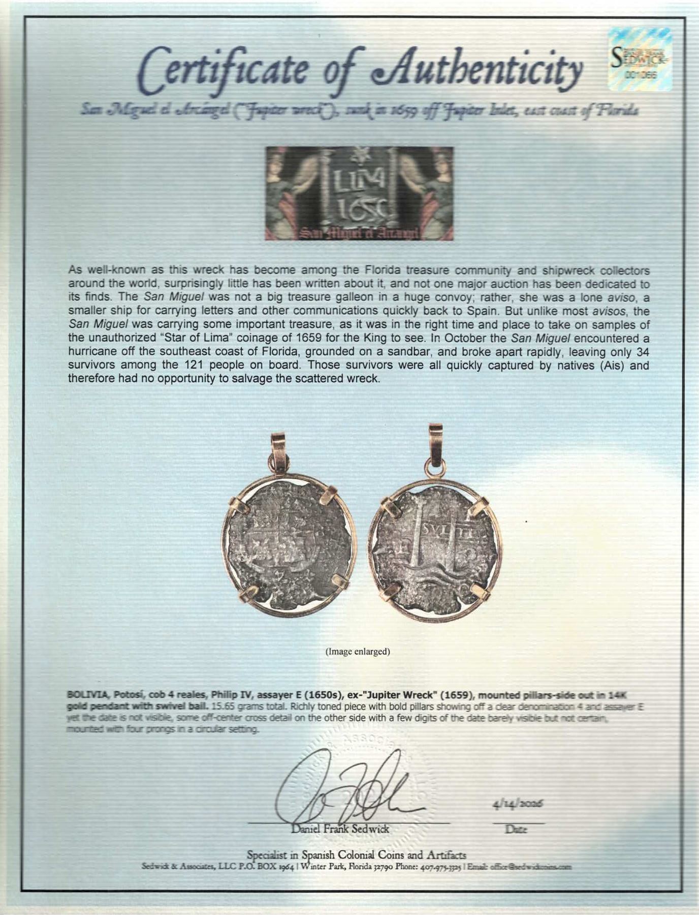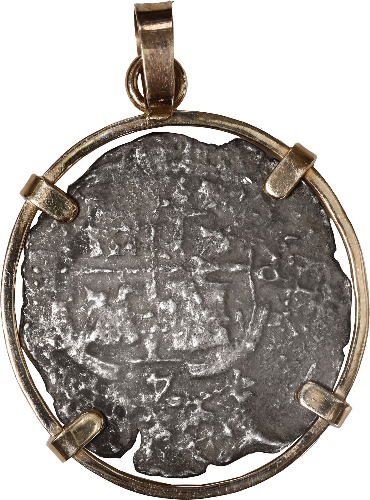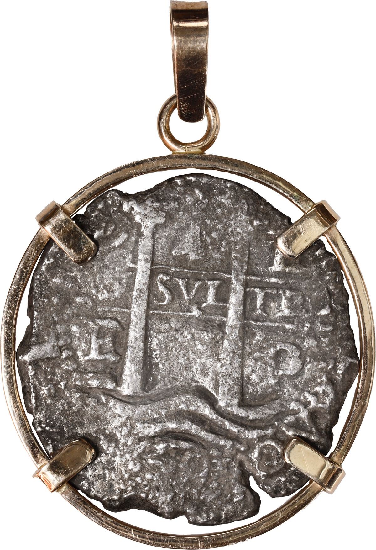 BOLIVIA, Potosí, cob 4 reales, Philip IV, assayer E (1650s), ex-"Jupiter Wreck" (1659), mounted pillars-side out in 14K gold pendant with swivel bail. 15.65 grams total. Richly toned piece with bold pillars showing off a clear denomination 4 and assayer E yet the date is not visible, some off-center cross detail on the other side with a few digits of the date barely visible but not certain, mounted with four prongs in a circular setting. From the "Jupiter Wreck (1659), with certificate.