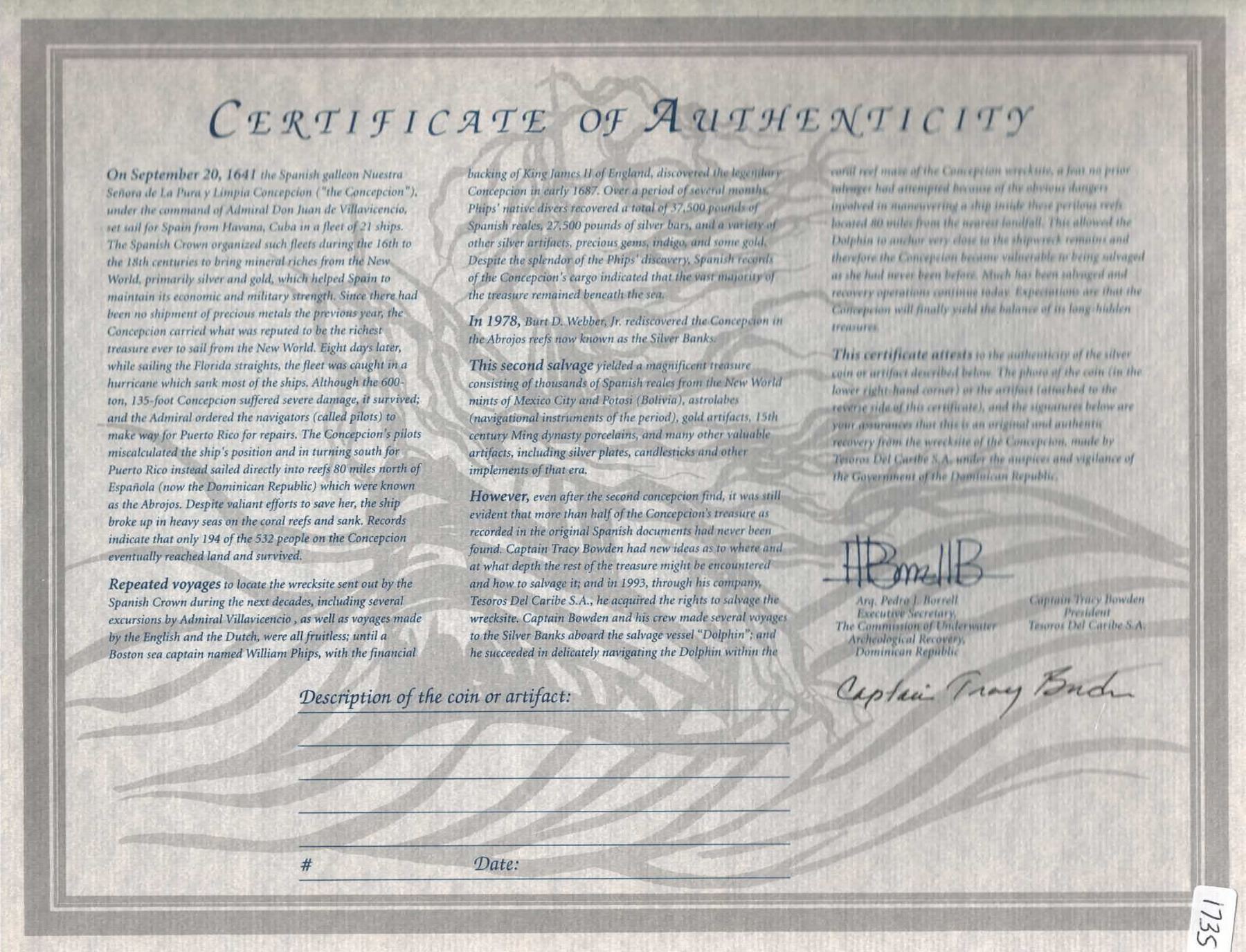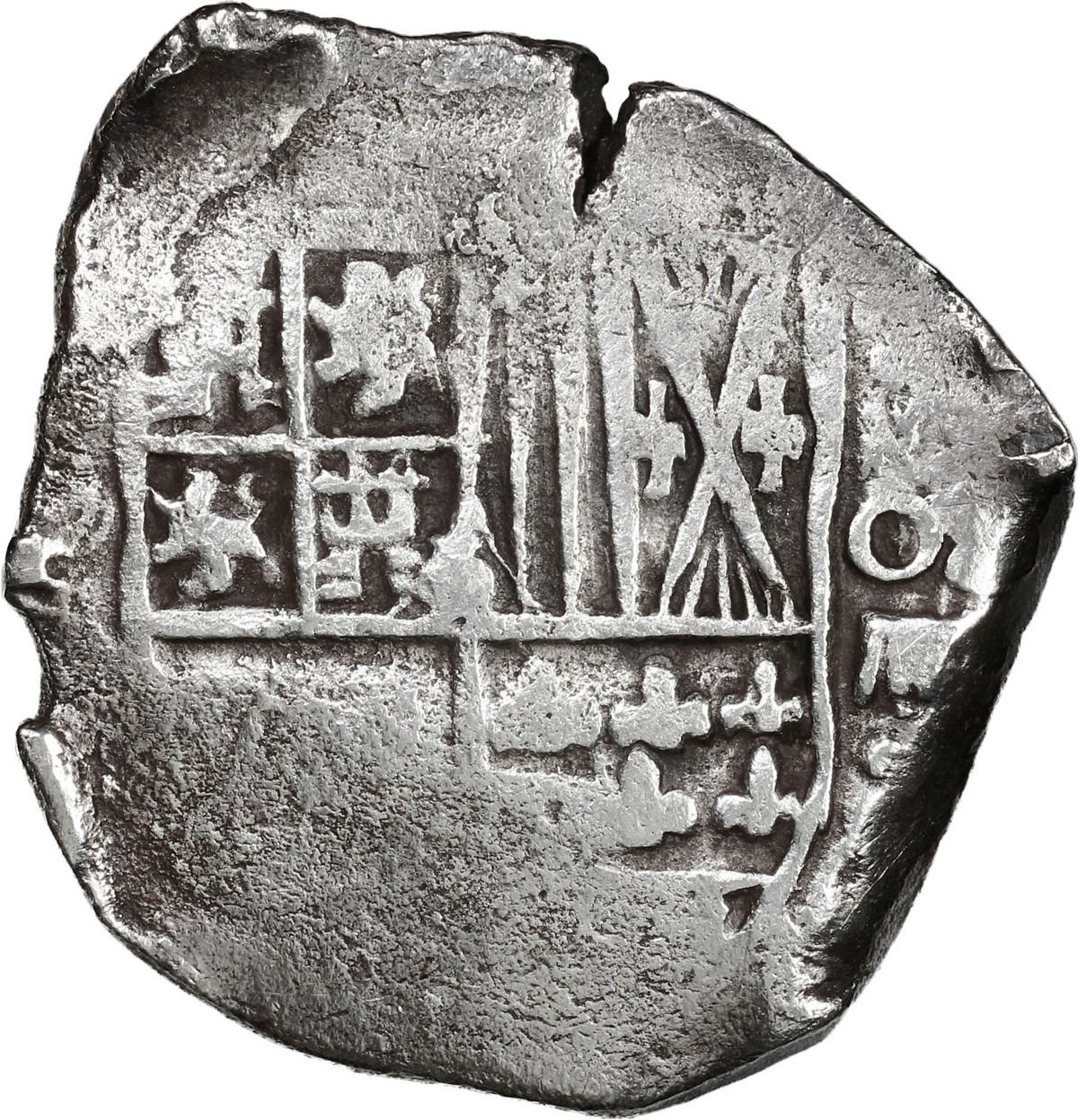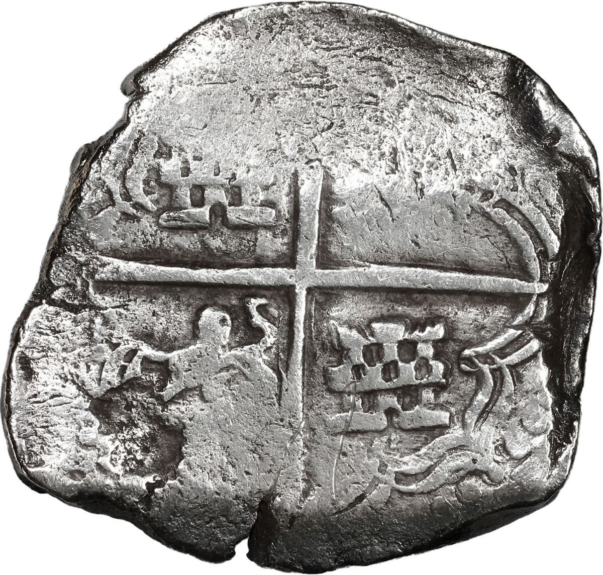 BOLIVIA, Potosí, cob 4 reales, Philip IV, assayer not visible (1640s). KM-17a; Cal-Type 279. 11.80 grams. Solid piece struck on a crude planchet, bold partial shield and cross with "flat" lions that were revived in the early 1640s (also denomination o-iiii) but with distinctive "checkerboard" castles, very minimal surface corrosion. With original certificate from Captain Tracy Bowden through his contract with the Dominican Republic. Recovered from: Concepción, sunk in 1641 off Hispaniola