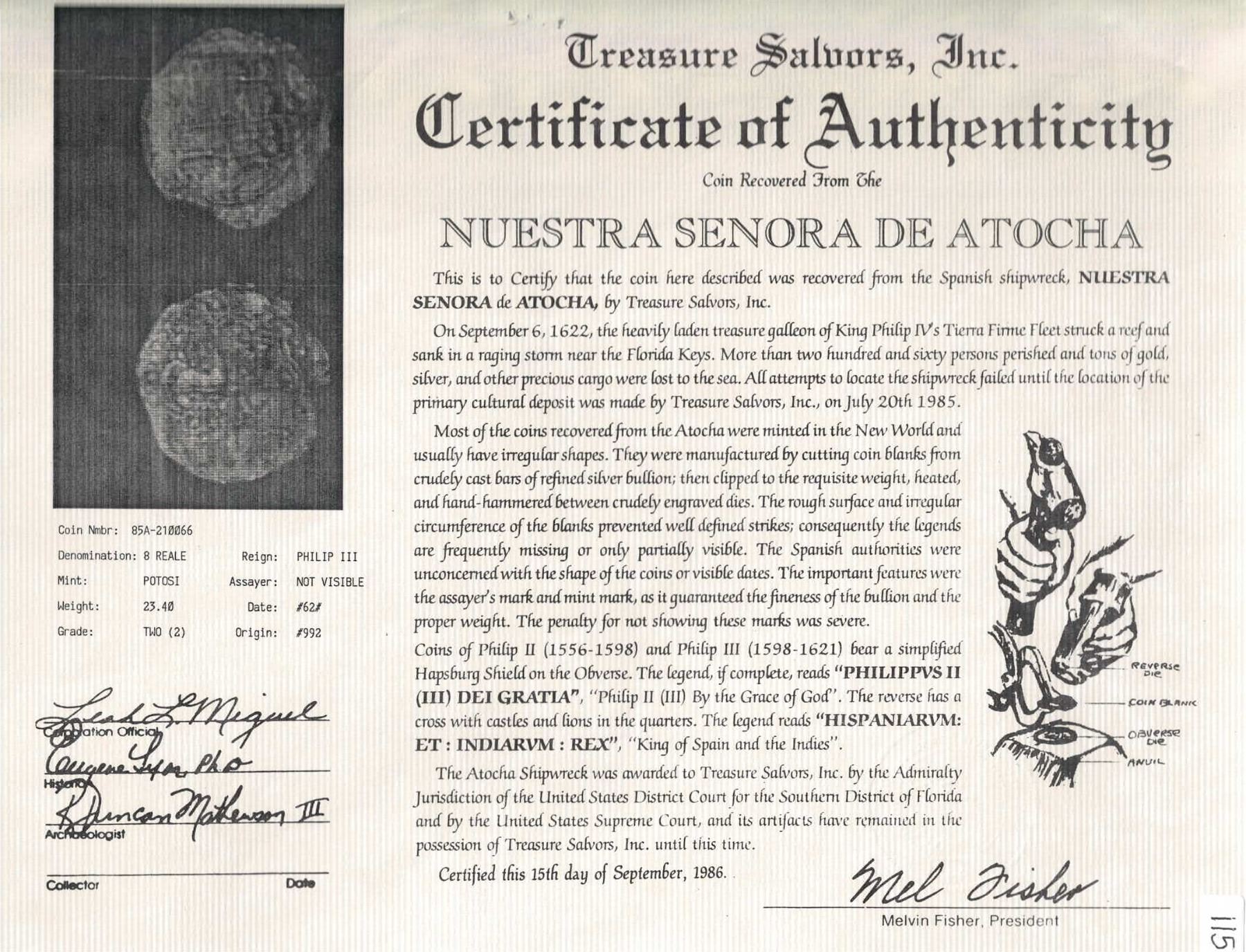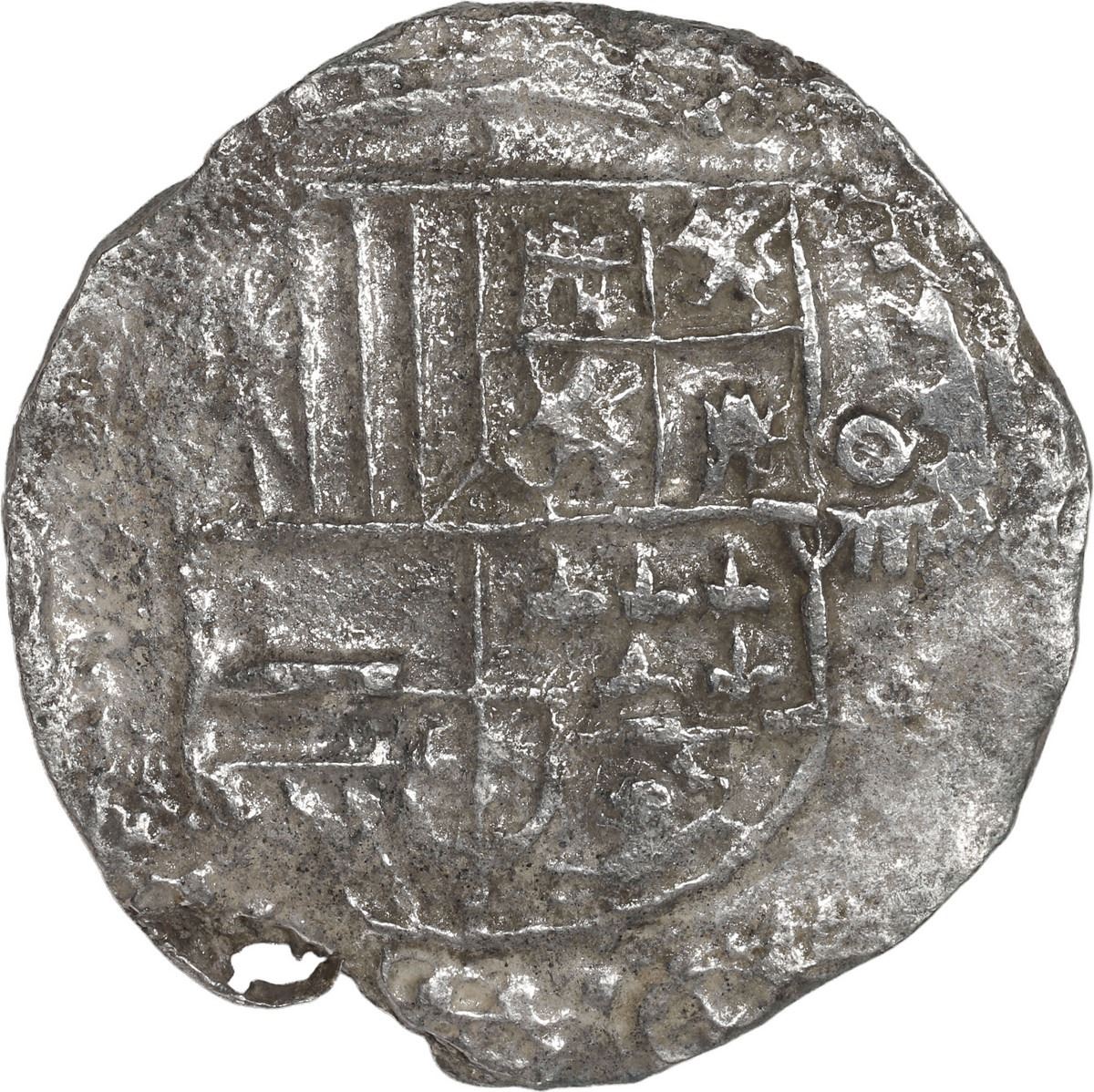 BOLIVIA, Potosí, cob 8 reales, (1)62(?) (T), upper half of shield and quadrants of cross transposed, Grade 2. KM-10; Cal-Type 165. 23.43 grams. Bold full shield and well-detailed full cross-and-tressure (both with transposition errors), clear 62 of date, light to moderate corrosion, lightly toned over silvery surfaces. With original Fisher tag and certificate 85A-210066, and pedigreed to Sedwick Auction 8, with original lot-tag 473. Recovered from: Atocha, sunk in 1622 west of Key West, Florida
