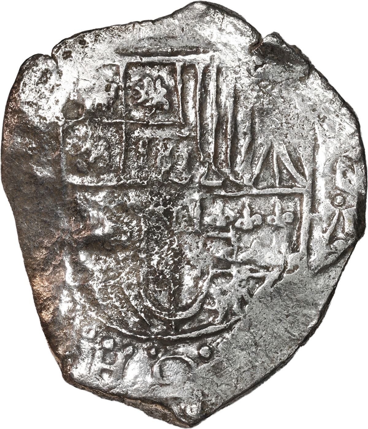 BOLIVIA, Potosí, cob 8 reales, 161(7-8) M or PAL. KM-10; Cal-Type 165. 22.12 grams. Bold full 161 of date with the second 1 appearing twice due to doubling (looks like 1611 but isn't), lacking dots below (an aspect of 1617 M and 1618 PAL only), some edge-loss from corrosion but with nice and full nice cross and shield, rather silvery surfaces. From the Atocha (1622), with original Fisher tag 85A-152320.