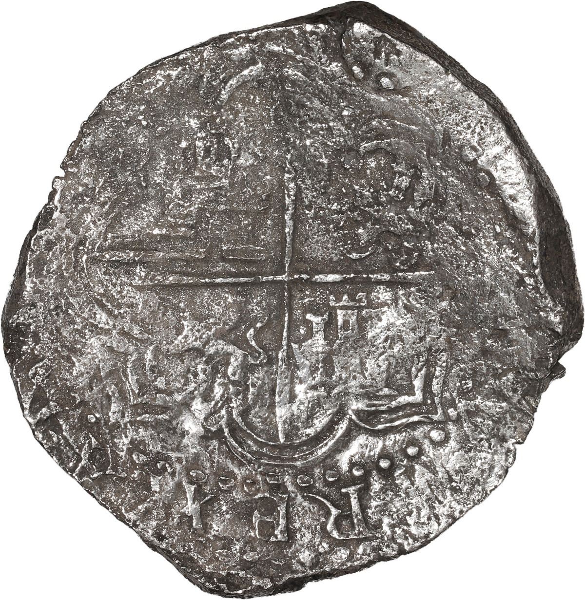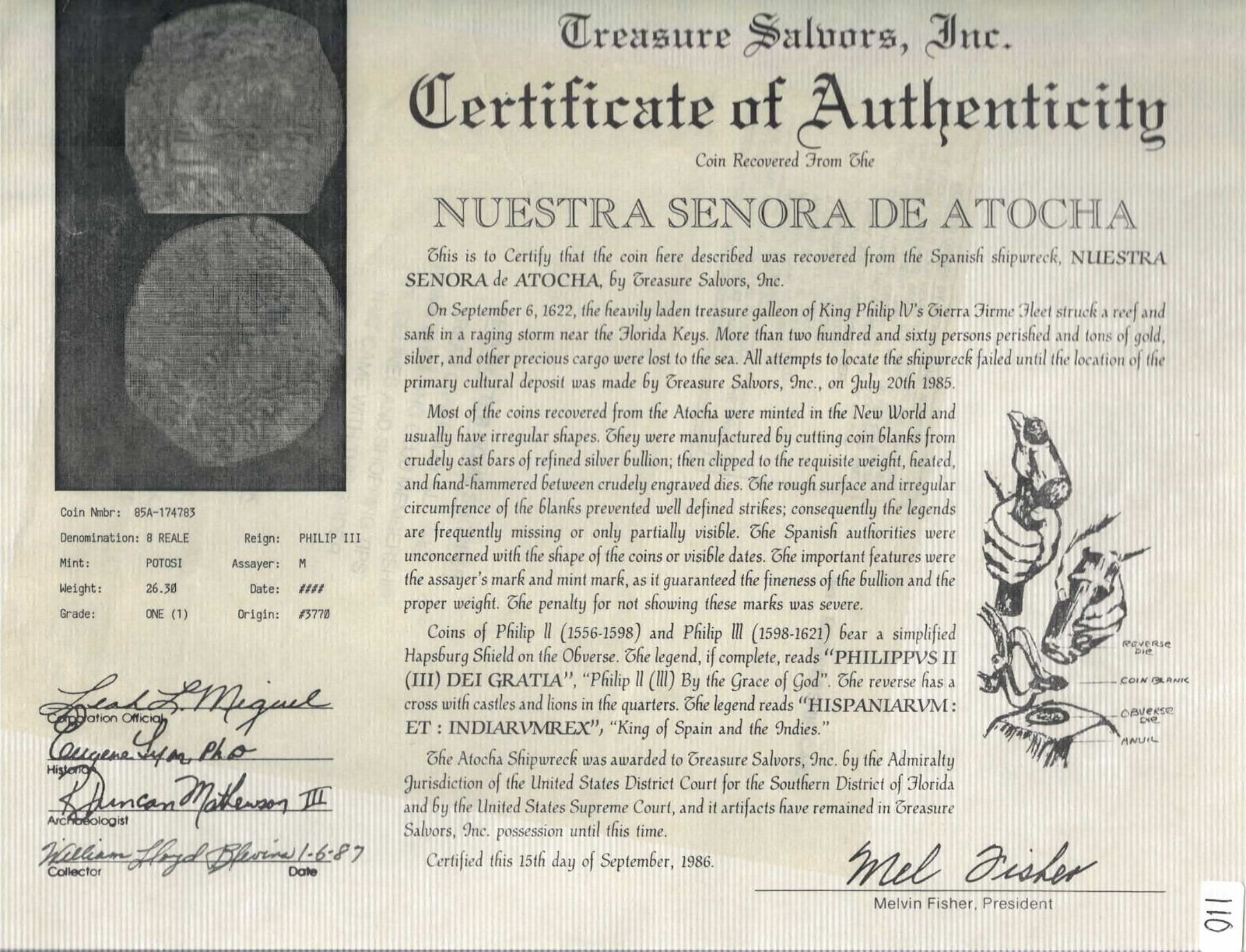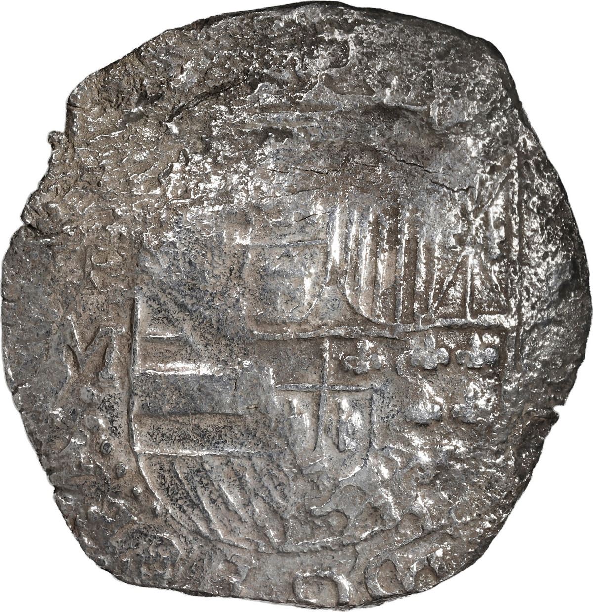 BOLIVIA, Potosí, cob 8 reales, (1617) M, Grade 1. S-P19; KM-10; Cal-921. 25.13 grams. Broad flan (unevenly thick and somewhat concave) with full shield and cross, bold assayer M, light to moderate corrosion (especially near edge), typically silvery. With original Fisher tag and certificate 85A-174783 and Home Shopping Club purchase receipt from 1986. Recovered from: Atocha, sunk in 1622 west of Key West, Florida