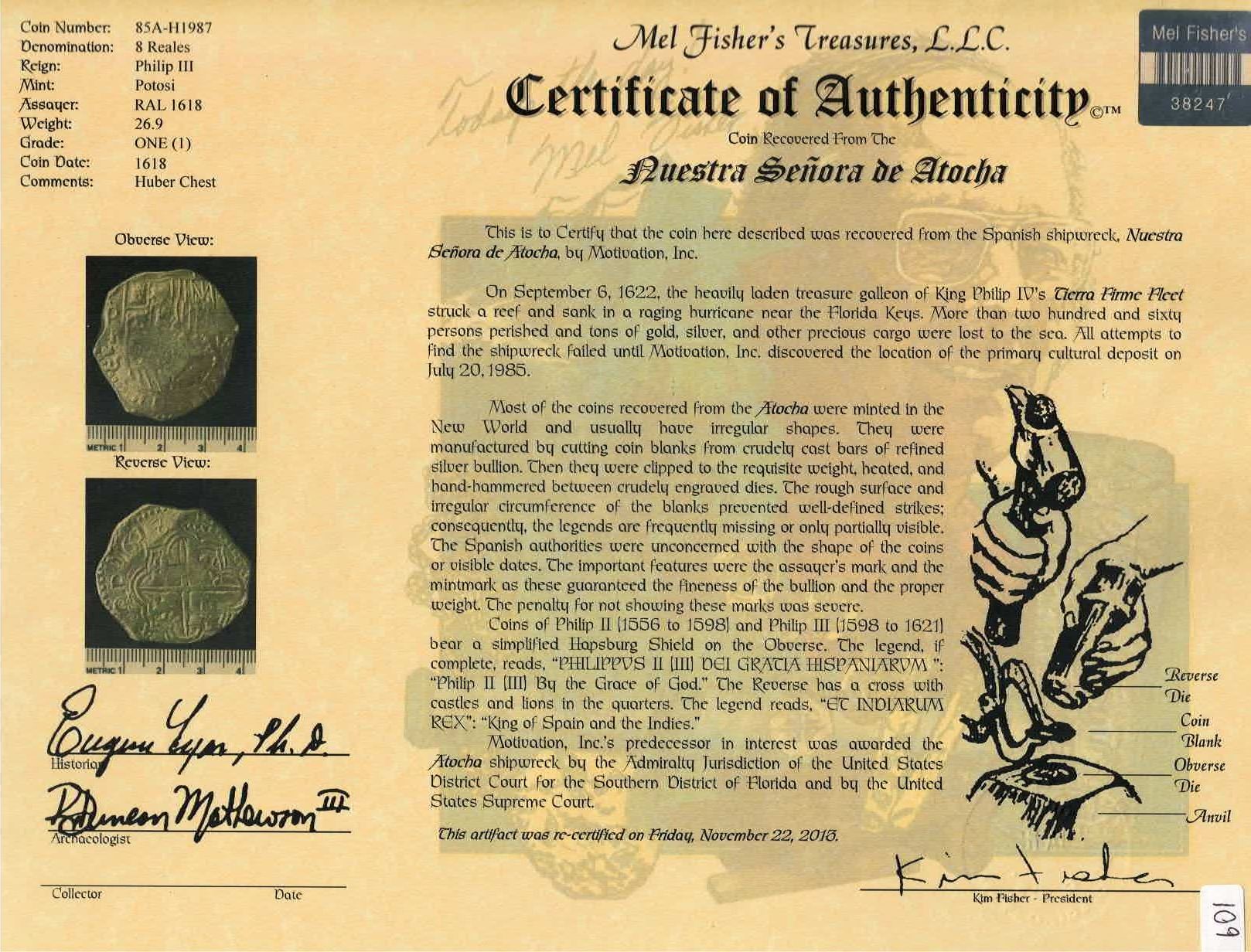 BOLIVIA, Potosí, cob 8 reales, 1618 PAL, rare, Grade 1. S-P20; KM-10; Cal-922. 26.93 grams. Odd-shaped flan with no corrosion, 100% full date outside of full but weaker cross, clear P-PAL and king's ordinal outside of full but slightly doubled shield, nicely toned. With Fisher tag and photo-certificate 85A-H1987 and 2013 appraisal for $12,600, plus copy of original Miguel certificate and 1987 invoice from Ted Miguel. Recovered from: Atocha, sunk in 1622 west of Key West, Florida