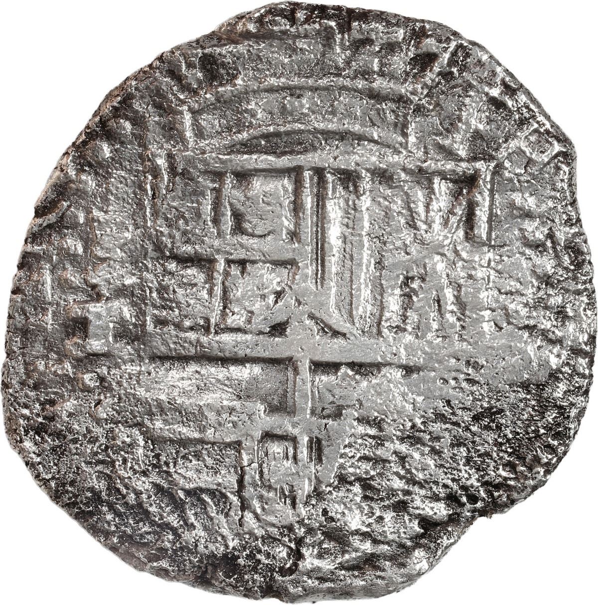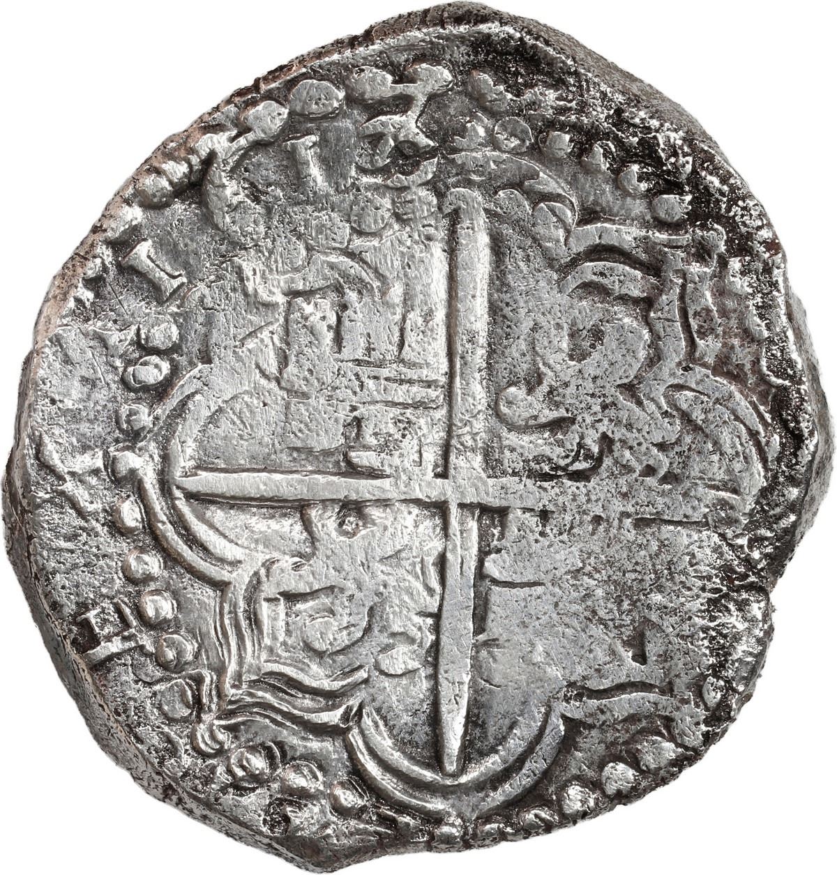 BOLIVIA, Potosí, cob 8 reales, 1618 T. S-P21; KM-10; Cal-925. 24.54 grams. Full date outside of good full cross with slight doubling giving the appearance of an A (for ANO) before the date, bold full assayer to left of complete shield with particularly bold crown above, silvery surfaces with light corrosion. From the Atocha (1622), with original Fisher tag 85A-188186 (certificate missing).