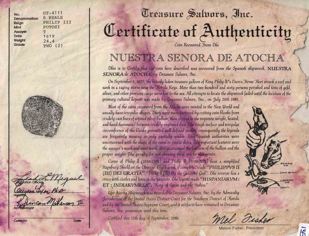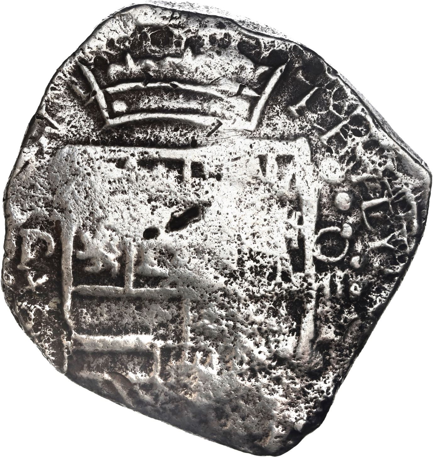 BOLIVIA, Potosí, cob 8 reales, 1619 T, Grade 2. S-P21; KM-10; Cal-927. 24.58 grams. Full but compact date at 12 o'clock (not mentioned on certificate) above weak and doubled cross, the full shield also partially weak but the crown choice, full assayer and denomination, lightly toned, minimal corrosion. With original Fisher certificate GT-4111 (water damaged, tag missing). Recovered from: Atocha, sunk in 1622 west of Key West, Florida