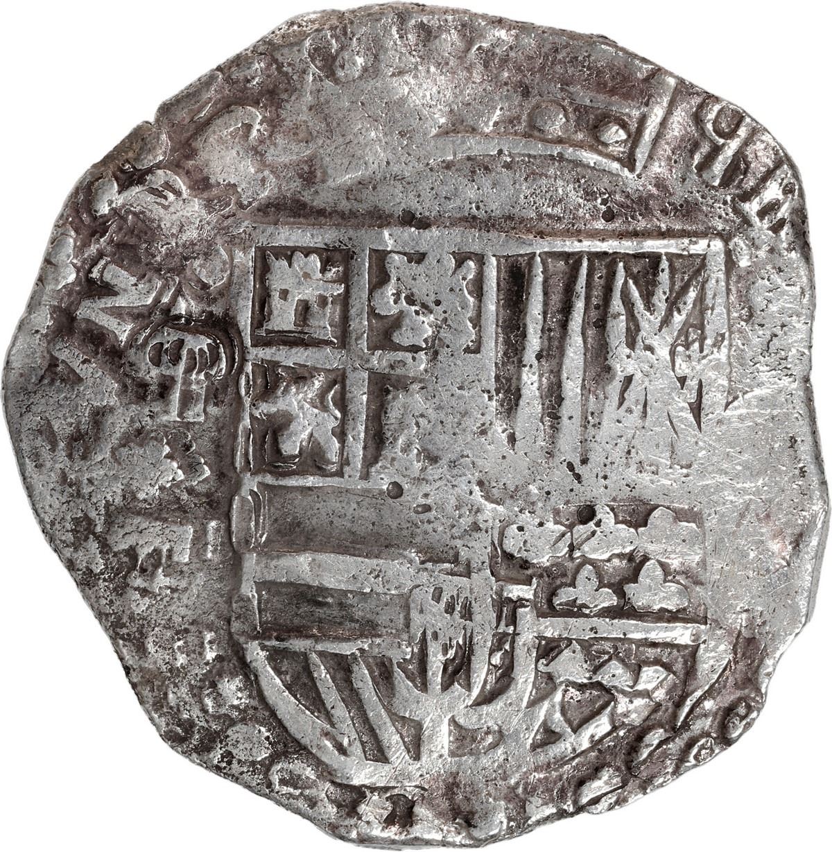 BOLIVIA, Potosí, cob 8 reales, 1620 T, quadrants of cross transposed, mintmark retrograde P over normal P. S-P21; KM-10; Cal-930. 26.59 grams. Bold date outside of very slightly doubled full cross-and-tressure, choice full shield with mintmark-assayer q/P+T to left, AXF with toning in crevices, minimal surface corrosion. From the Atocha (1622), with original Fisher tag 85A-209493 (certificate missing).