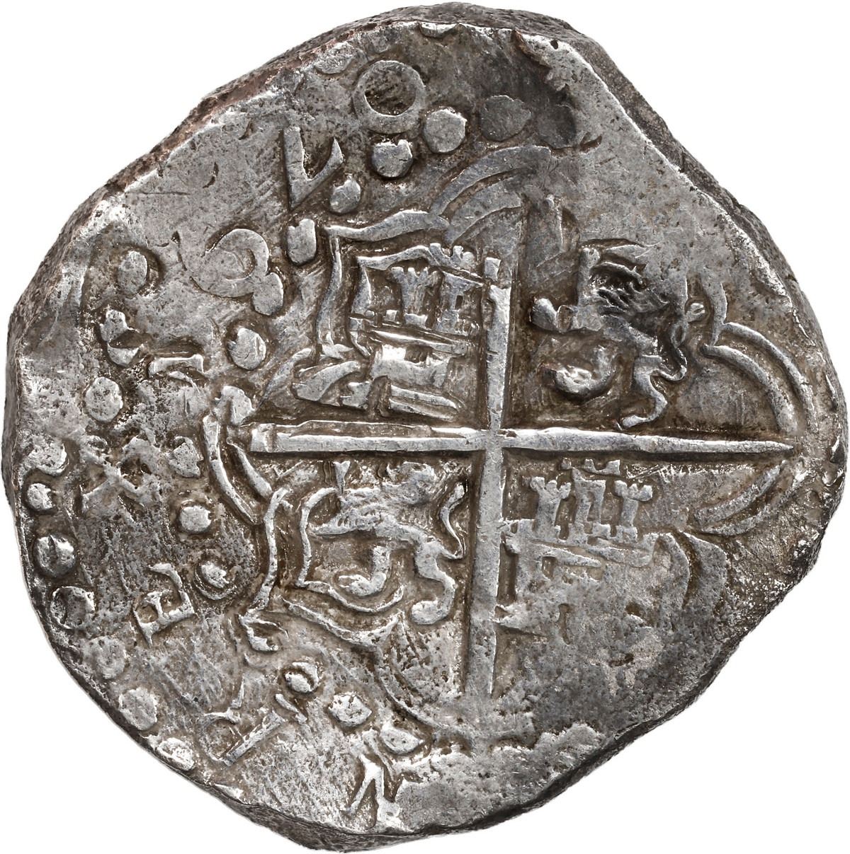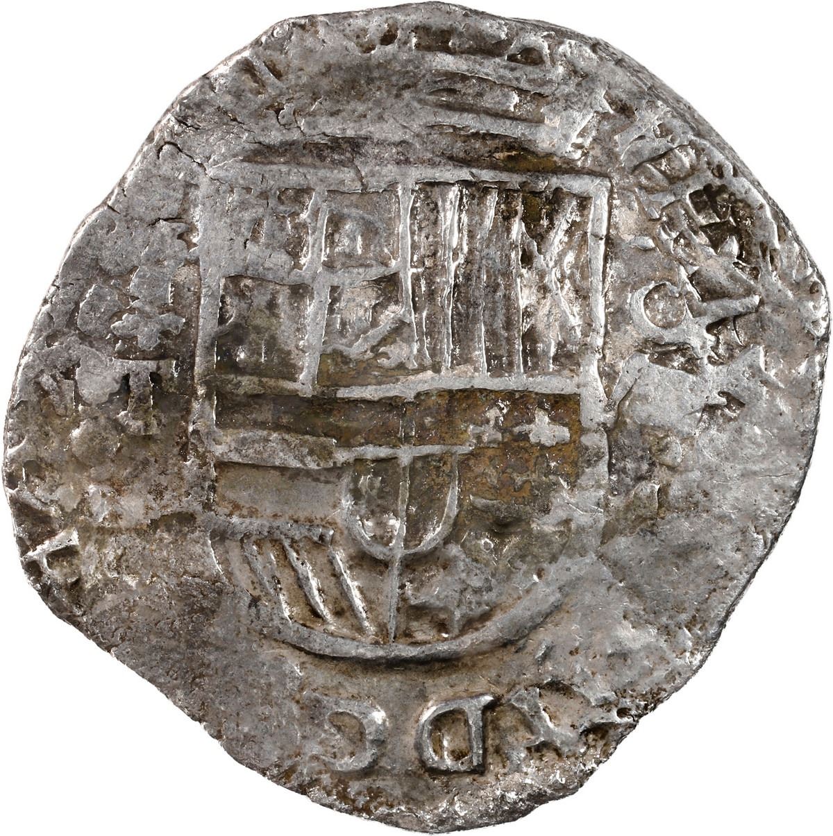 BOLIVIA, Potosí, cob 8 reales, 1620 T. S-P21; KM-10; Cal-929. 26.52 grams. Bold full cross with 100% complete date (rare thus), the rather small shield (4R sized?) also full and bold, AU with light toning and areas of brown encrustation but no corrosion despite its provenance. From the Atocha (1622), original tag and certificate missing but 85A-212541 in Fisher database.