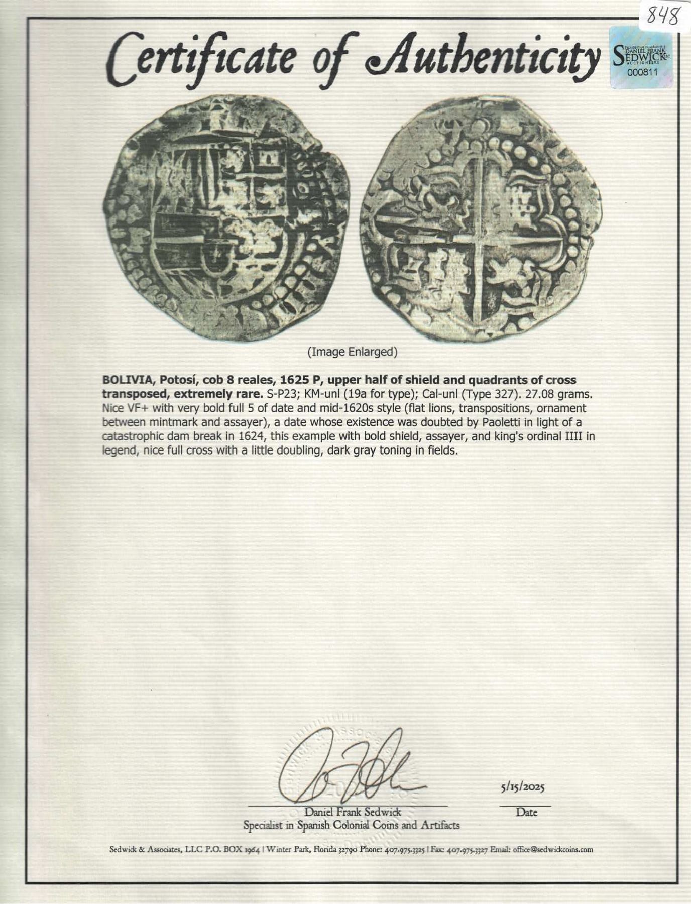 BOLIVIA, Potosí, cob 8 reales, 1625 P, quadrants of cross transposed, "flat" lions, very rare, PCGS VF20, finest and only example in PCGS census, ex-Sellschopp (Plate). S-P23; KM-19a; Cal-1443. 27.02 grams. Very bold full shield and (slightly doubled) cross with full final digit of date that looks like a 9 but is actually a 5, followed by erroneous ETD, full king's ordinal IIII, clear assayer P below + ornament (normally a • in this period, per the next lot), contrastingly toned. Note: Hairline crack in slab. Pedigreed to the Sellschopp Collection (stated on label), Plate Coin 438 in his 1971 book Las acuñaciones de las cecas de Lima, La Plata y Potosí, also lot 641 in the Swiss Bank Corp. auction of September 1988, with Sedwick photo-certificate.