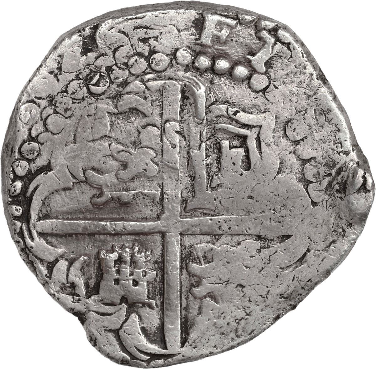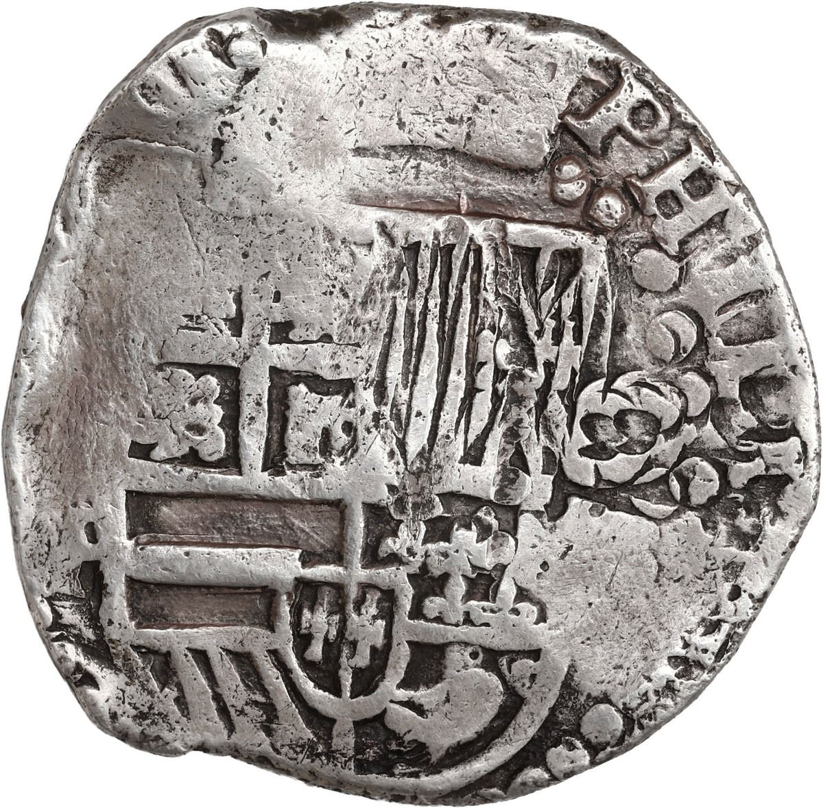 BOLIVIA, Potosí, cob 8 reales, 1626 P, quadrants of cross transposed, "flat" lions, very rare. S-P23; KM-19a; Cal-1445. 26.93 grams. Clear date outside of full but off-center and slightly doubled cross, bold full shield with double right side, bold PHILI(PVS), clear assayer P, unevenly thick VF with toning on fields. Pedigreed to the El Dorado (Almanzar) auction of July 1984, with original lot-tag 485 (erroneously cataloged as 1646 TR).
