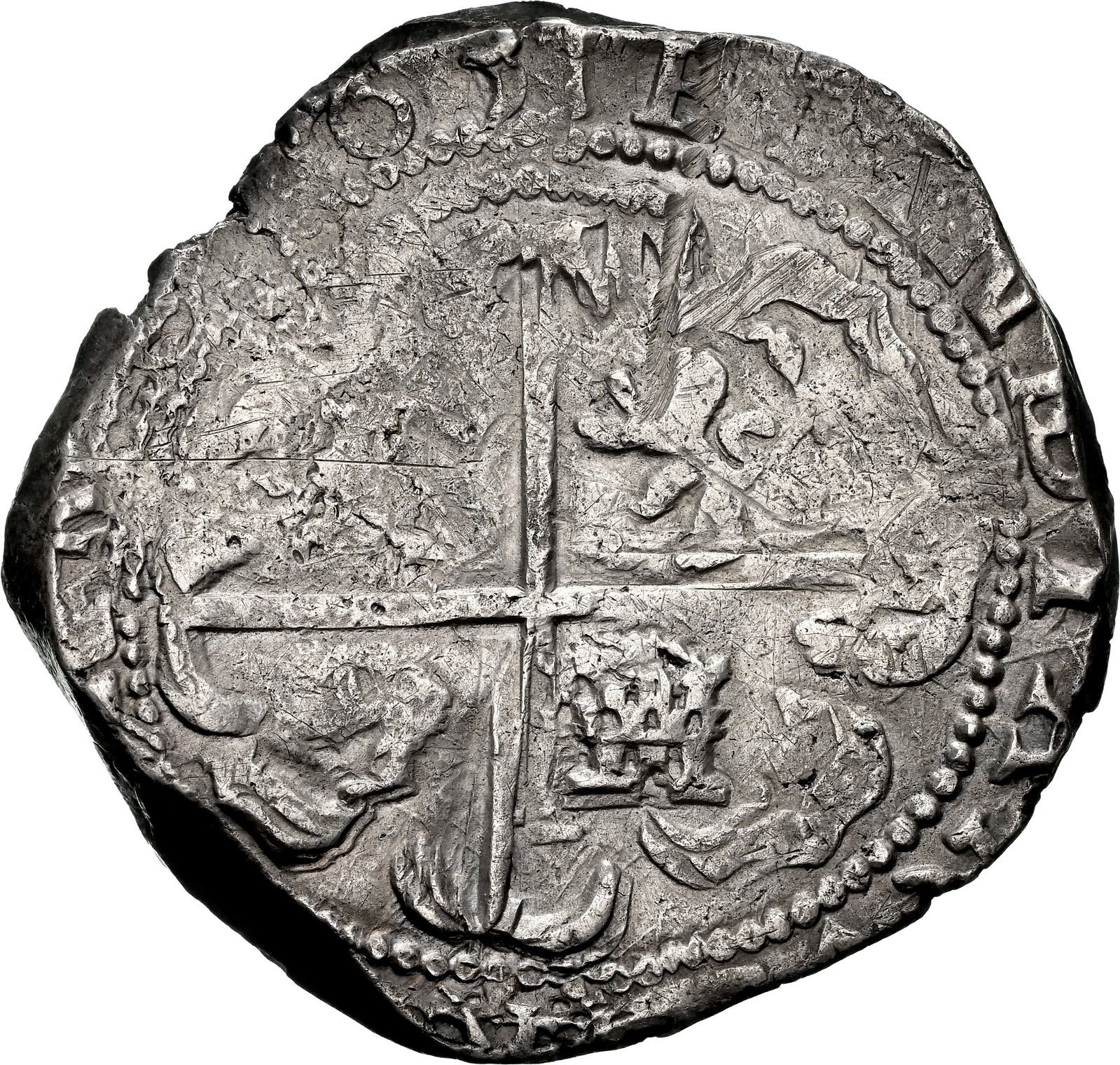 BOLIVIA, Potosí, cob 8 reales, 1631 T, cross-fleury ornaments, NGC AU details / rev scratched. S-P26; KM-19a; Cal-1456. 26.63 grams. Broad flan with bold full PHILIPPVS IIII and 631 of date in legends, full cross (weak) and shield with clear PxT to left and x8x to right (the x's being distinctive cross-fleury ornaments), lightly toned.