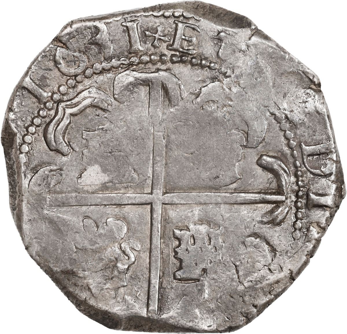 BOLIVIA, Potosí, cob 8 reales, 1631 T. S-P26; KM-19a; Cal-1456. 27.32 grams. Very deeply rainbow-toned AVF with 100% full date followed by cross-fleury ornament, the cross full but weaker, with well-detailed shield flanked by assayer and denomination (the former next to a scratched flat area that includes a possibly re-engraved mintmark).
