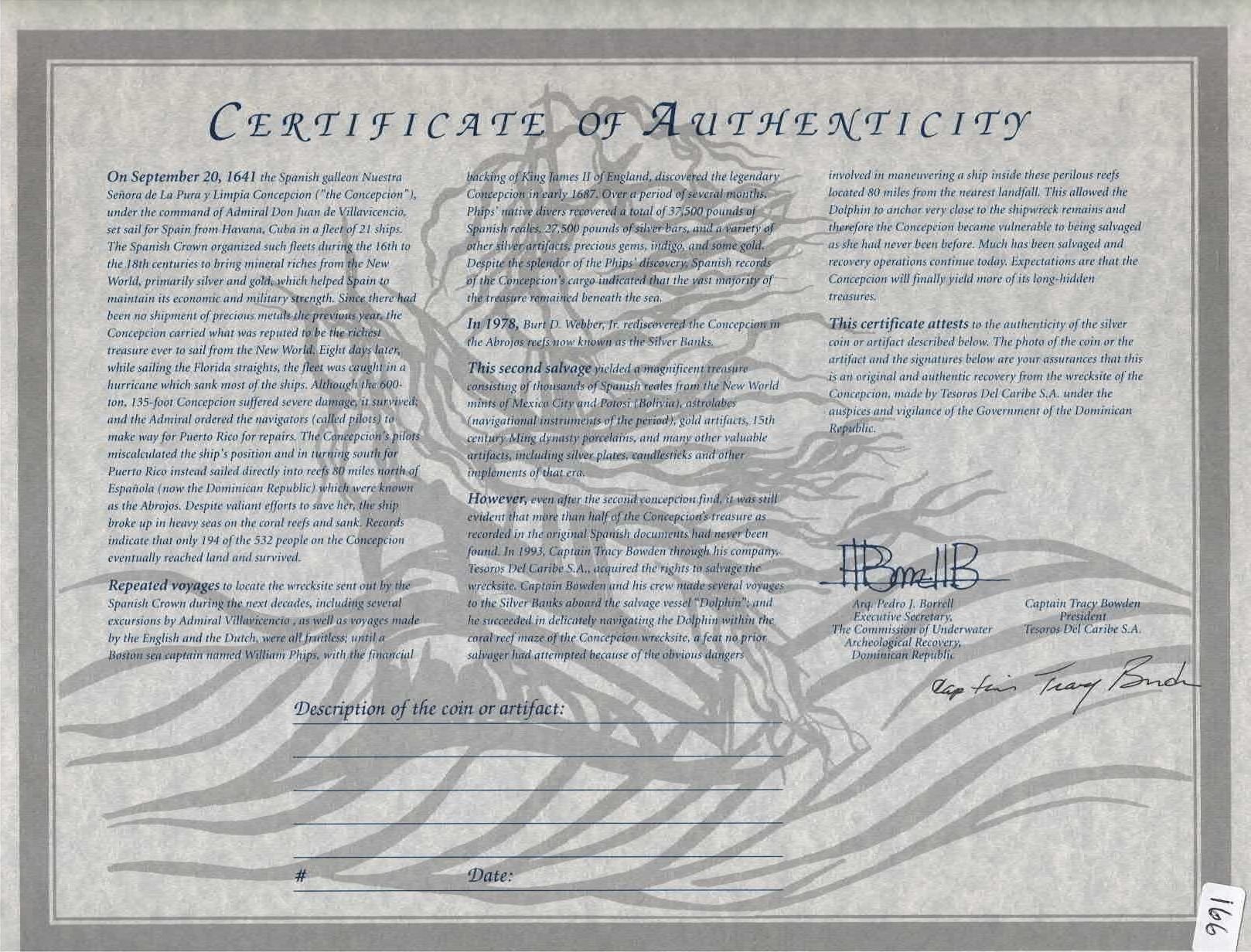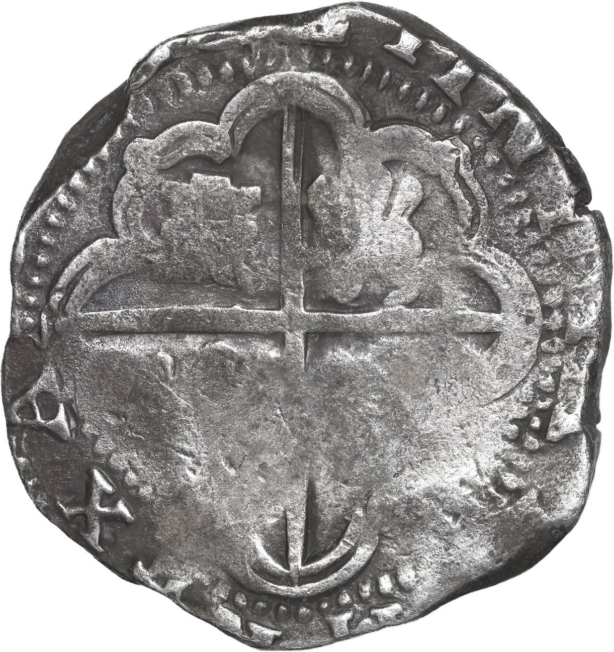 BOLIVIA, Potosí, cob 8 reales, 1632 T. S-P26; KM-19a; Cal-1457. 25.86 grams. Full but centrally weak shield and cross with bold denomination •8•, clear •P•T•, just the bases of 32 of date visible, no corrosion, toned in crevices. With original certificate from Captain Tracy Bowden through his contract with the Dominican Republic. Recovered from: Concepción, sunk in 1641 off Hispaniola