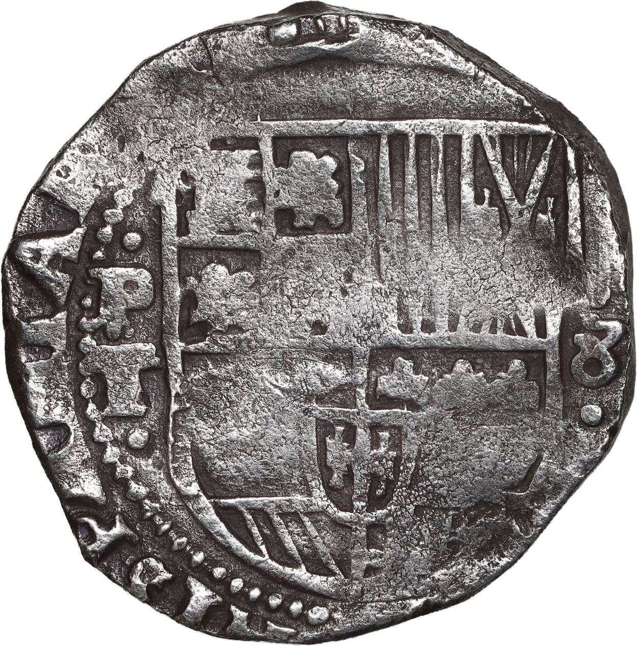 BOLIVIA, Potosí, cob 8 reales, 1635 T, rare. S-P26; KM-19a; Cal-1460. 25.40 grams. Choice, corrosion-free example with bold full 5 of date, full •P•T• and •8•, full but weaker shield and cross (the tressure rather prominent), toned around details. With original certificate from Captain Tracy Bowden through his contract with the Dominican Republic. Recovered from: Concepción, sunk in 1641 off Hispaniola