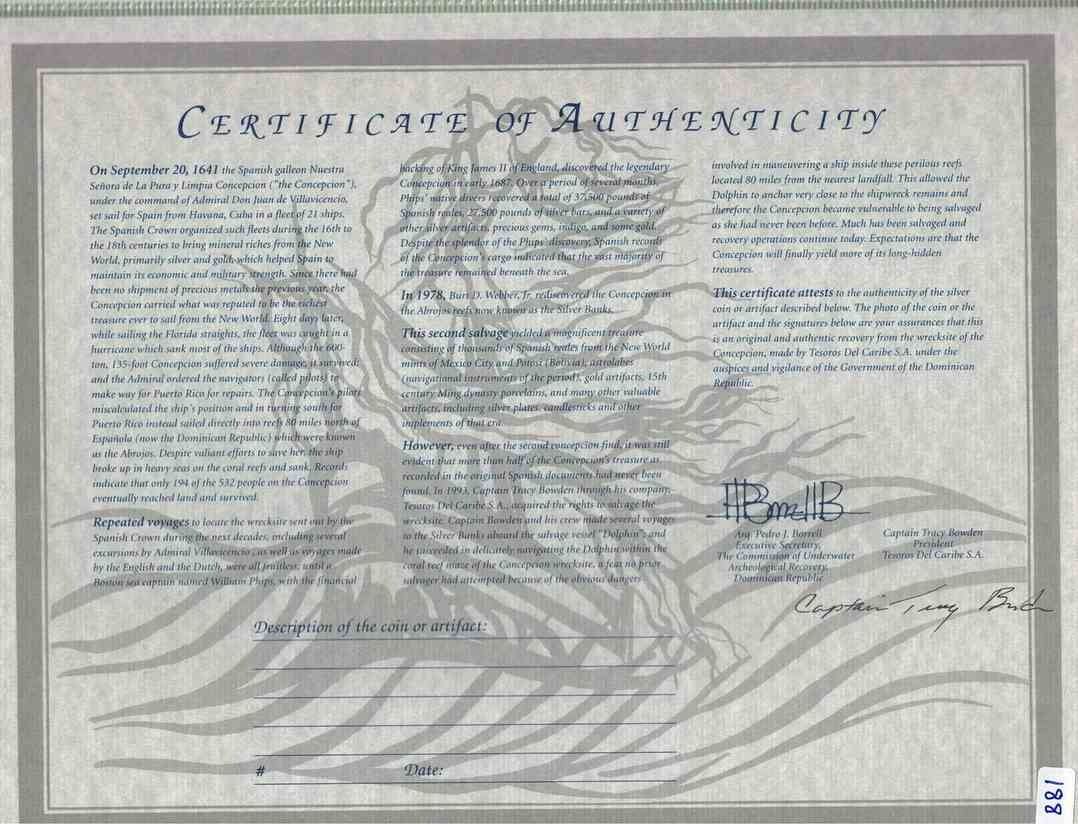 BOLIVIA, Potosí, cob 8 reales, 1636 T. S-P26; KM-19a; Cal-1462. 25.59 grams. Bold full final 6 of date outside of full cross (partially flat due to uneven thickness), full but slightly doubled shield with bold denomination •8• to right, lightly toned, minimal surface corrosion. With original certificate from Captain Tracy Bowden through his contract with the Dominican Republic. Recovered from: Concepción, sunk in 1641 off Hispaniola
