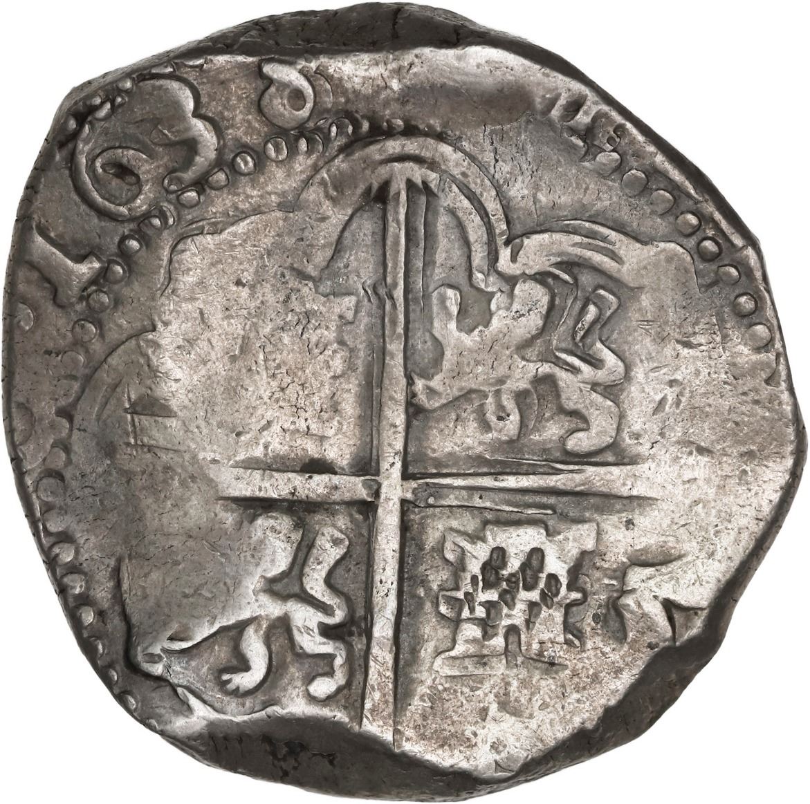 BOLIVIA, Potosí, cob 8 reales, 1638 TR, ex-Ponte. S-P27; KM-19a; Cal-1465. 27.47 grams. Very bold full date and assayer (scarce, but very rare this complete) and denomination •8•, decent full shield and cross despite typically chunky flan, Fine with only faint light toning. Pedigreed to the Luis R. Ponte Collection and to the Superior auction of June 1978 (lot 533).