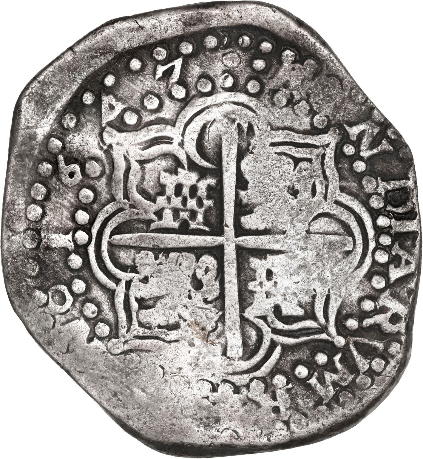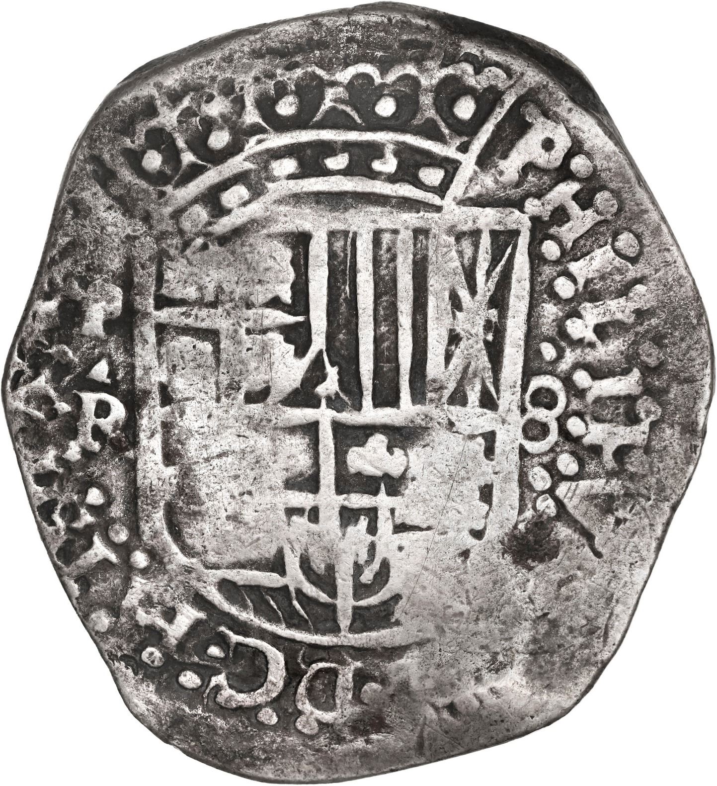 BOLIVIA, Potosí, cob 8 reales, 1647 R, extremely rare, ex-Ponte, ex-Faistauer, Janson Plate. S-P31; KM-19a; Cal-1482; Janson-13.27.3. 26.01 grams. This is one of the most exciting Potosí shield-type 8R we have ever handled, as it is a "smoking gun" for the debasement scandal that resulted in a global monetary crisis and the eventual execution of its perpetrators, most notably the assayer Felipe Ramírez de Arellano, whose initial R stands out so clearly and boldly on this coin. In fact, almost everything on this broad-flan VF coin is visible, particularly the full and bold date in the nearly full legend, in addition to the full shield and cross that are much more evenly struck than usual for this period, with nice toning to boot. Overall, the coin seems almost like a failed "Royal" striking, with no other Royals of this assayer known for comparison. Perhaps most interesting of all, confirmed by its dull color and slightly low weight, is this coin's debased silver content, XRF-tested at 76.86% silver and 22.77% copper. By our records, it is a unique combination of date and assayer, as the only other 1647 8R known are T, TR or Z, although R is also known for 1646 and 1648, the latter date also seen with Z/R, after Zambrano finally replaced Ramírez, just one year before his execution for fraud and the official recall and melting of nearly all his coins in 1649. This important coin has spent many years in the hands of important collectors and will continue to do so. Pedigreed to the Luis R. Ponte Collection and to the Faistauer Collection (Jess Peters auction of April 1976, lot 301), also to Sedwick Auction 18 (lot 635), Plate Coin on page 53 of Carlos Janson's La Moneda Circulante en el Territorio Argentino (2020).