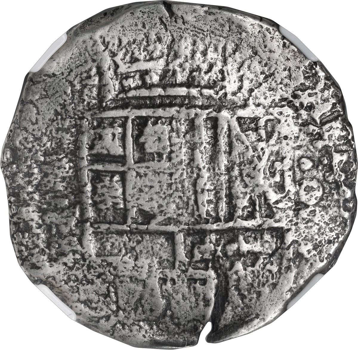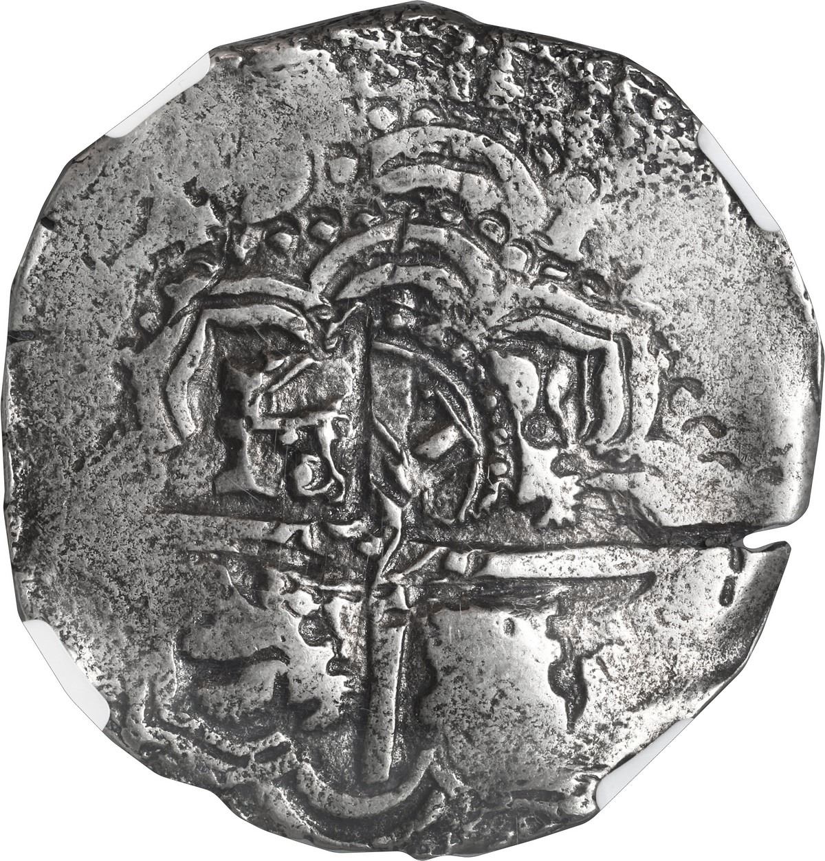 BOLIVIA, Potosí, cob 8 reales, 1649 Z, with crowned-L countermark on cross, NGC Genuine / La Capitana Shipwreck. S-P34; KM-19a; Cal-1485. Bold full cross with nearly full countermark in center, full 4 and most of 89 of date, also clear Z to left of full but lightly corroded shield (label does not note the date or assayer), toned in crevices, edge-split. Recovered from: Capitana, sunk in 1654 off Chanduy, Ecuador