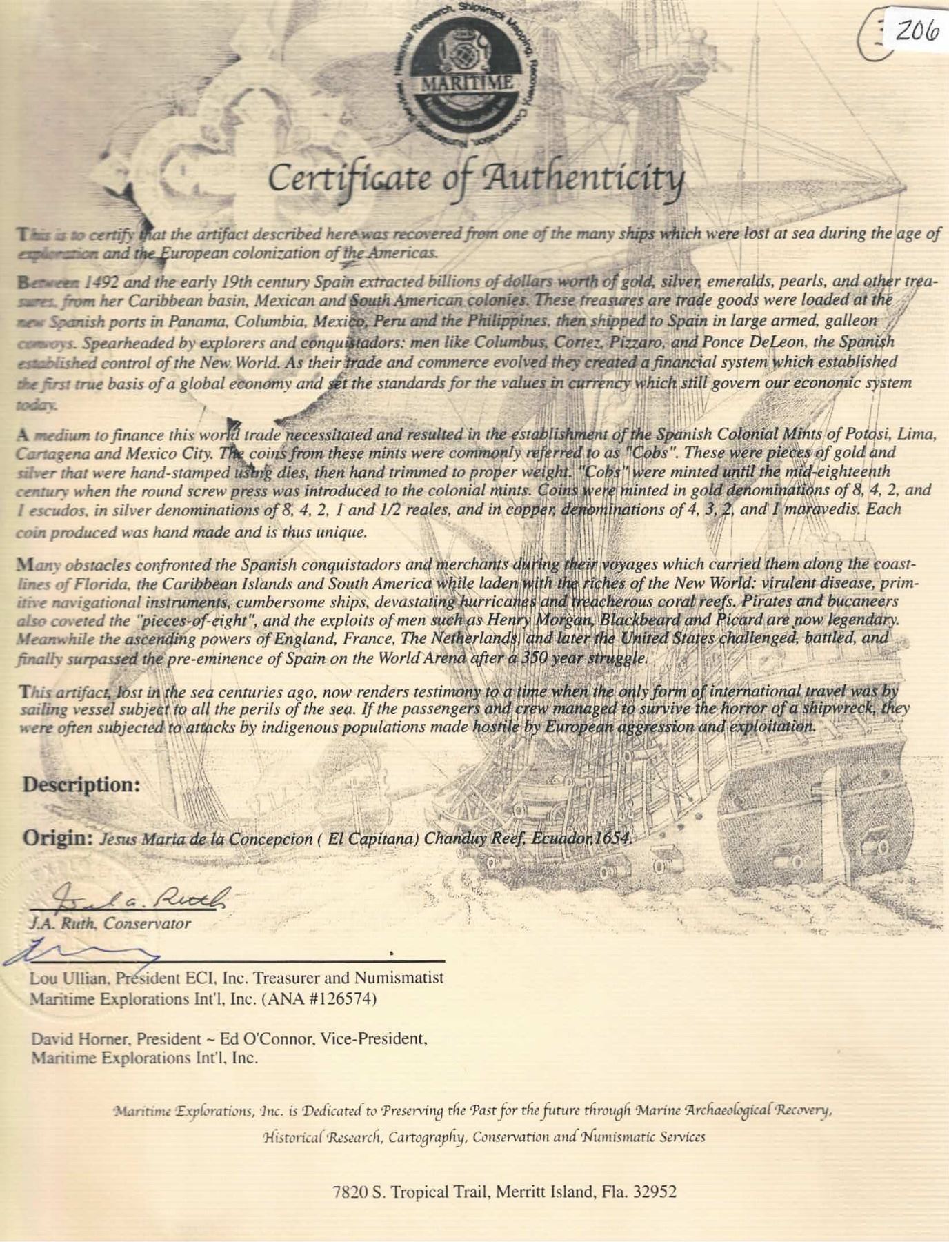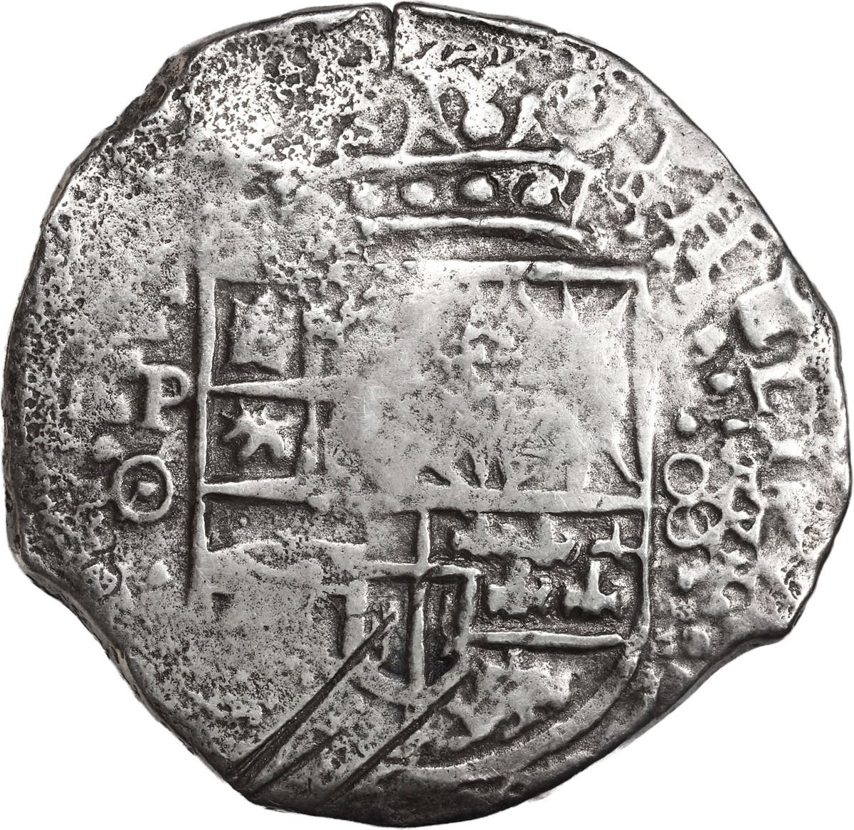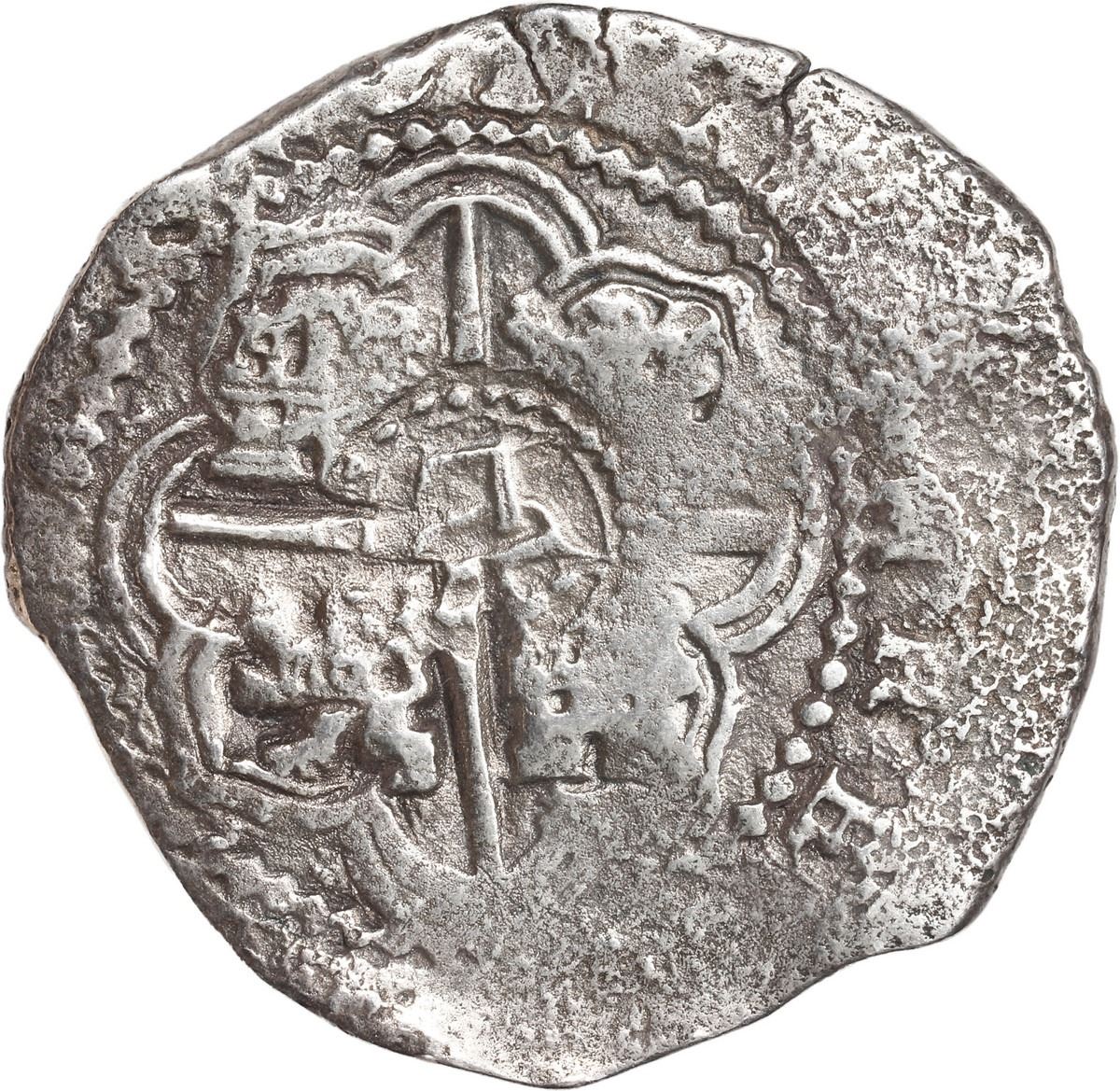 BOLIVIA, Potosí, cob 8 reales, 1650 O, mule of early obverse with new reverse, crowned-L countermark on cross, rare. S-P35; KM-19b; Cal-1488. 22.46 grams. Nearly full countermark in center of full cross (new style) with bottom half of 0 of date in legend, full shield with bold P-O to left and 8 to right (early style, Mastalir IA), old scratches at bottom, slightly thin from corrosion but nicely toned. With original certificate hand-signed by Joel Ruth and Lou Ullian. Recovered from: Capitana, sunk in 1654 off Chanduy, Ecuador