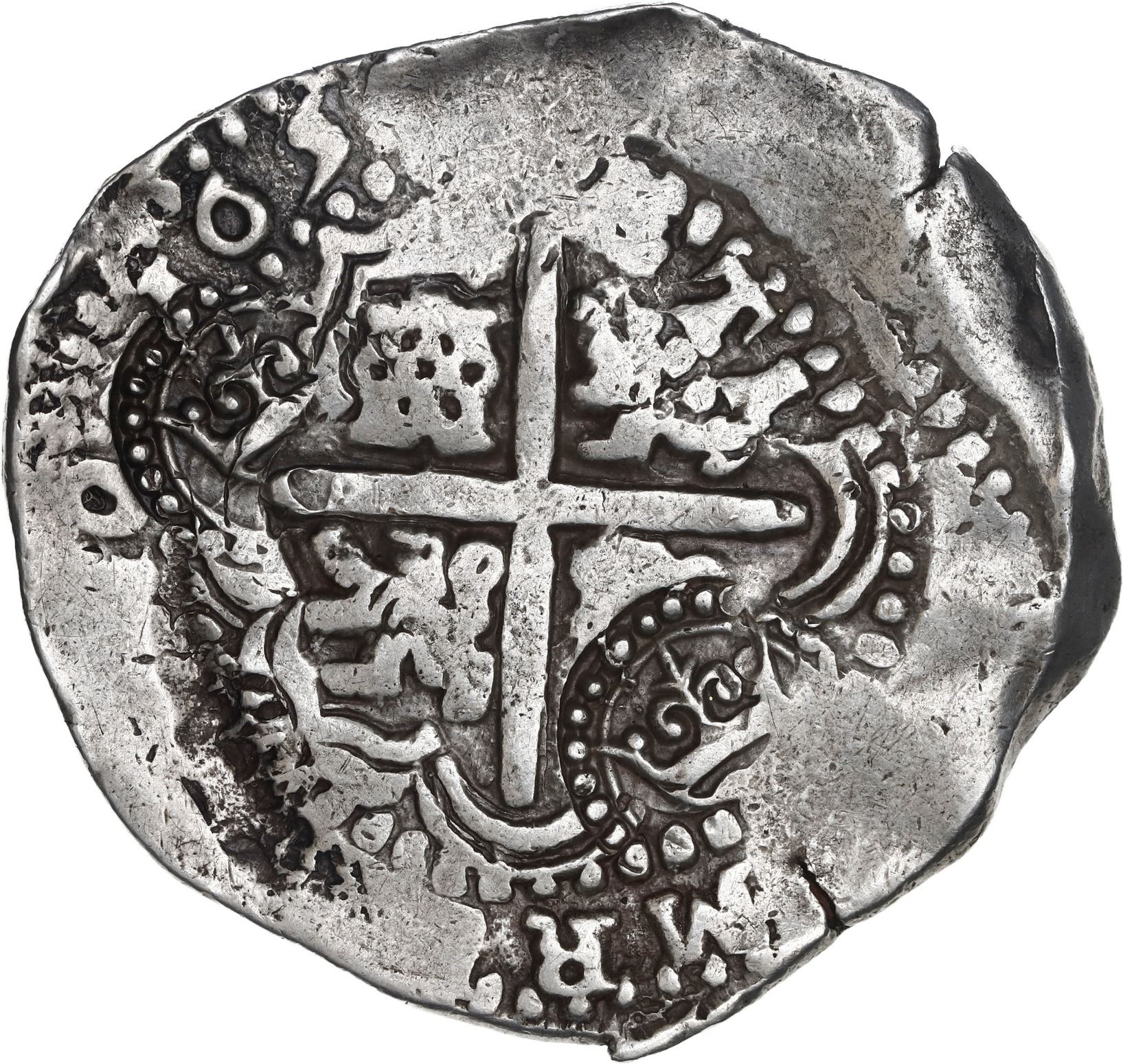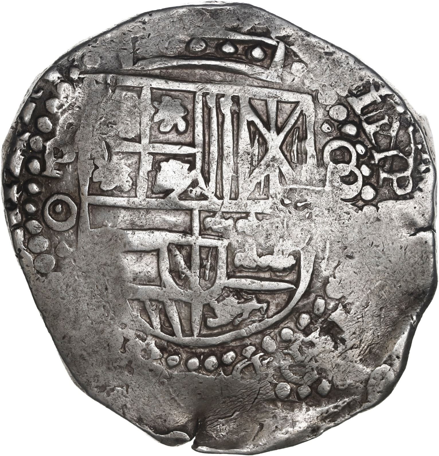 BOLIVIA, Potosí, cob 8 reales, 1650 O, with two crowned-O countermarks on the cross side. S-P35; KM-19b; Cal-1488. 26.78 grams. Very broad flan with great full shield and cross, the latter with bold 165 of date and two nearly full countermarks, full P-O to left and denomination 8 to right of shield, VF with contrasting toning, somewhat rare as non-shipwreck.