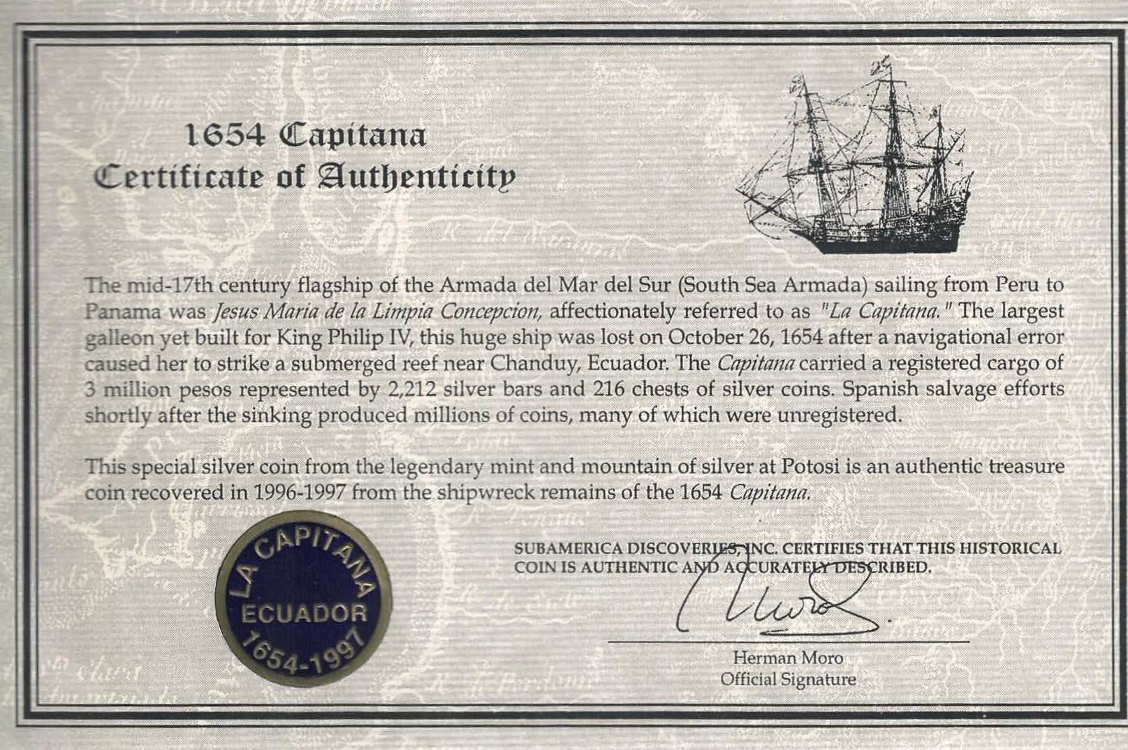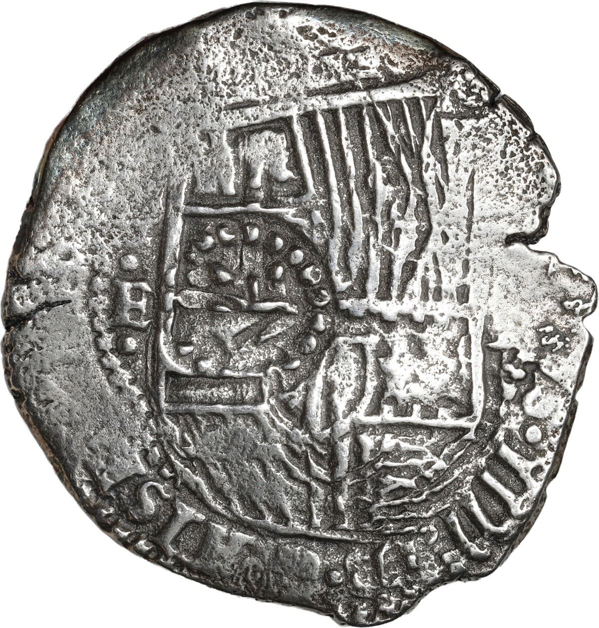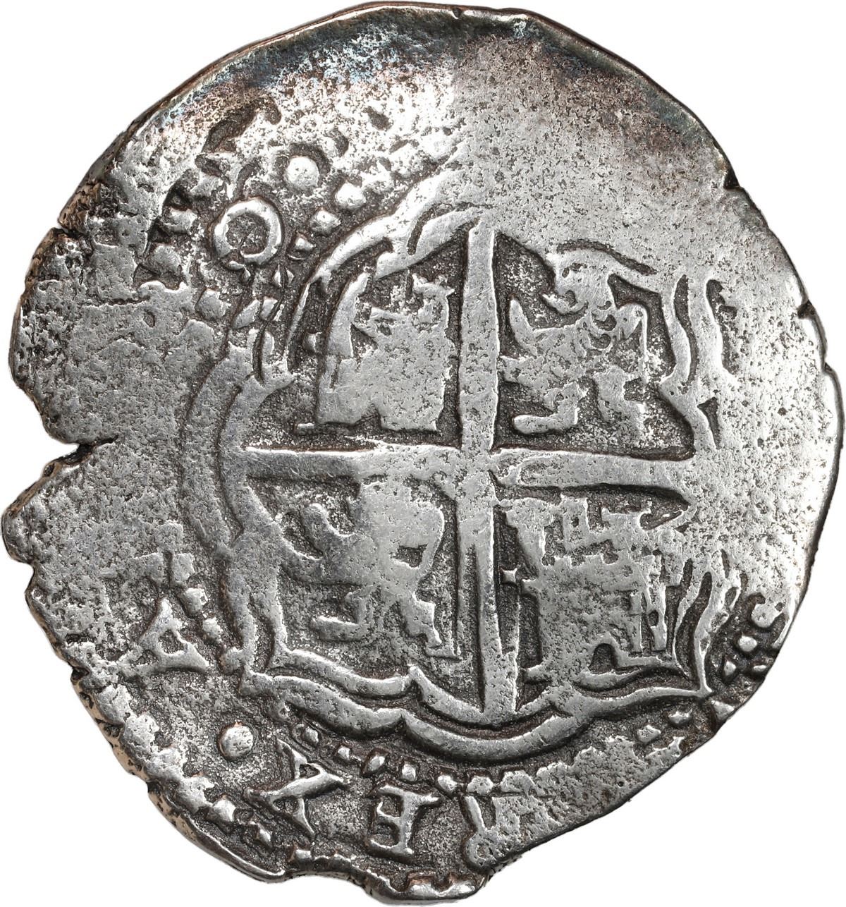 BOLIVIA, Potosí, cob 8 reales, (1651-2) E, with crown-alone countermark on shield. S-P36; KM-19b; Cal-Type 327. 23.57 grams. Bold full countermark near center of full but doubled shield with bold assayer E to left and king's ordinal IIII in legend, full cross with bold O of ANO in legend, thin from light corrosion, minor edge-crack. With original (generic) certificate from Herman Moro. Recovered from: Capitana, sunk in 1654 off Chanduy, Ecuador
