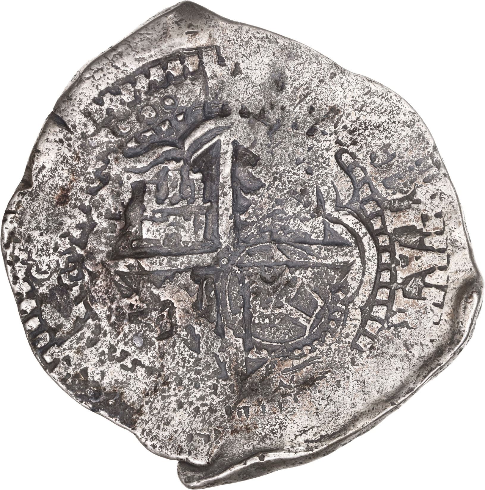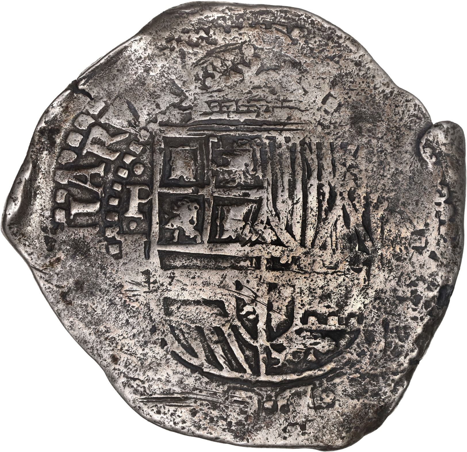 BOLIVIA, Potosí, cob 8 reales, (1651) E, three dots after date (extremely rare), with crowned-L countermark on cross. S-P36; KM-19b; Cal-1491. 24.82 grams. Rather broad flan extending past the outer border in places (parts of edge crude as made), full shield and cross, the former with clear P-E to left and the latter with full and clear countermark, date not visible but with series of three dots at 11 o'clock matching Mastalir's IIIBe2 (this perhaps only the second example known), unevenly toned, some light surface corrosion. Pedigreed to the Ponterio sale #106 of April 7-8, 2000, with original lot-tag 995. Recovered from: Capitana, sunk in 1654 off Chanduy, Ecuador