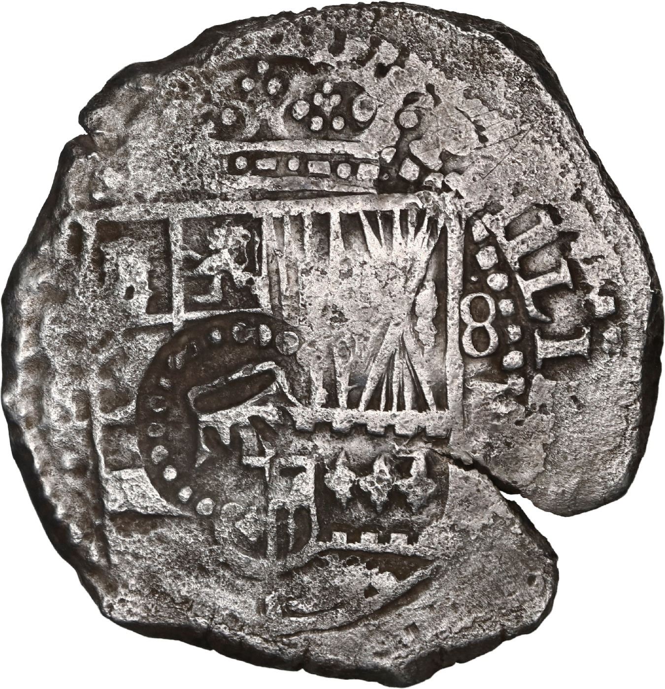 BOLIVIA, Potosí, cob 8 reales, 1651 E, with crown-alone countermark on shield. S-P36; KM-19b; Cal-1491. 24.53 grams. Full and bold date outside of full but weak cross, similar shield with most of countermark in center, nearly full crown, bold 8 to right, Fine details with edge-crack and minimal surface corrosion (probably from the Maravillas shipwreck of 1656), toned in crevices.