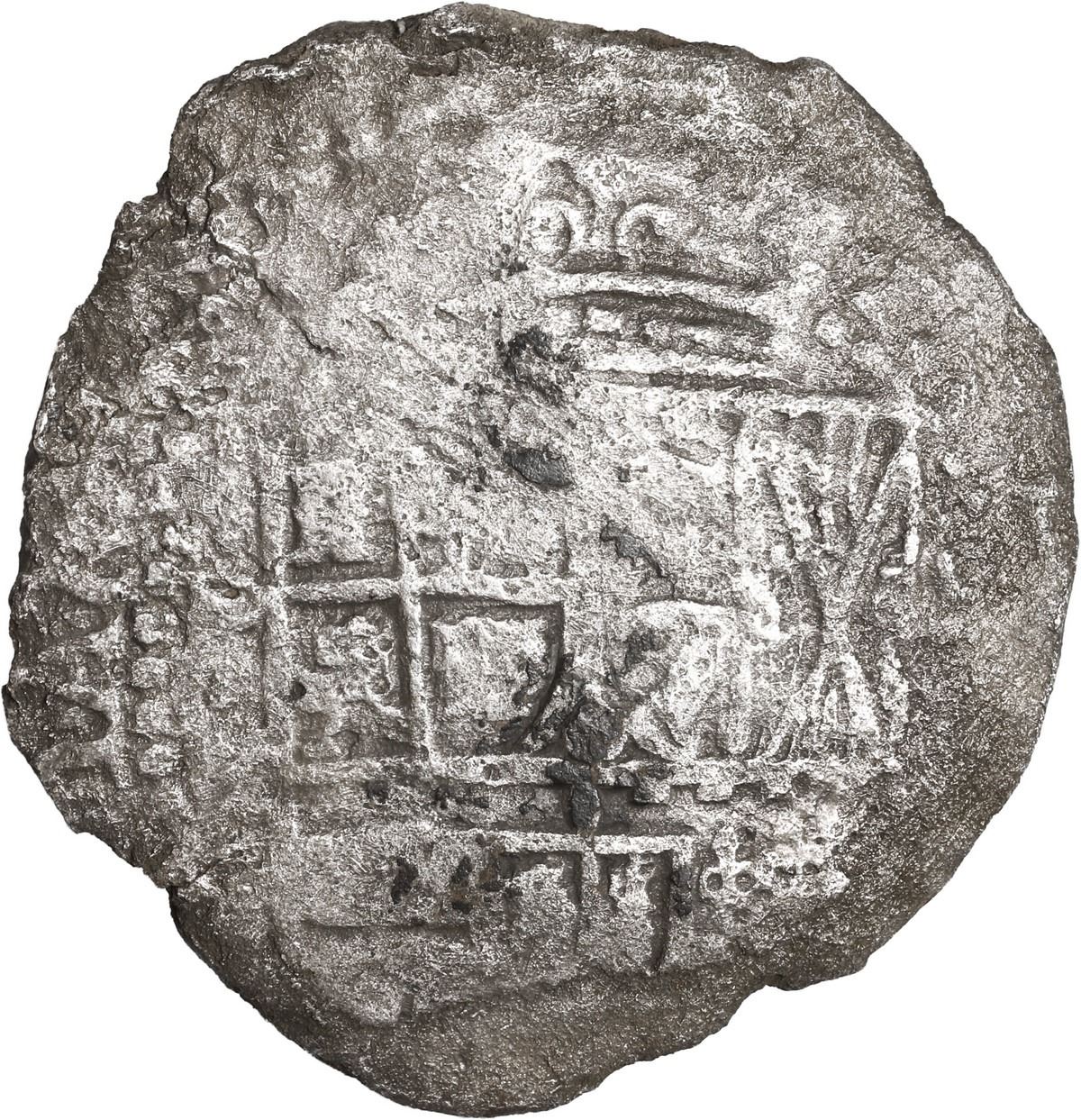 BOLIVIA, Potosí, cob 8 reales, 1651 (modern 5) O, with crown-alone (rare style) countermark on cross, ex-Maravillas Research Collection. S-P35; KM-19b; Cal-1489. 20.50 grams. Full cross with complete countermark on upper half that looks like a jester's cap (Mastalir K6b), bold 51 of date, nearly full but somewhat weak shield, light to moderate corrosion, unevenly toned. From the Maravillas Research Collection of Countermarked Potosí Cobs (Sedwick Auction 20, with original lot-tag 391), with original MAREX certificate and tag 0903. Recovered from: Maravillas, sunk in 1656 off Grand Bahama Island
