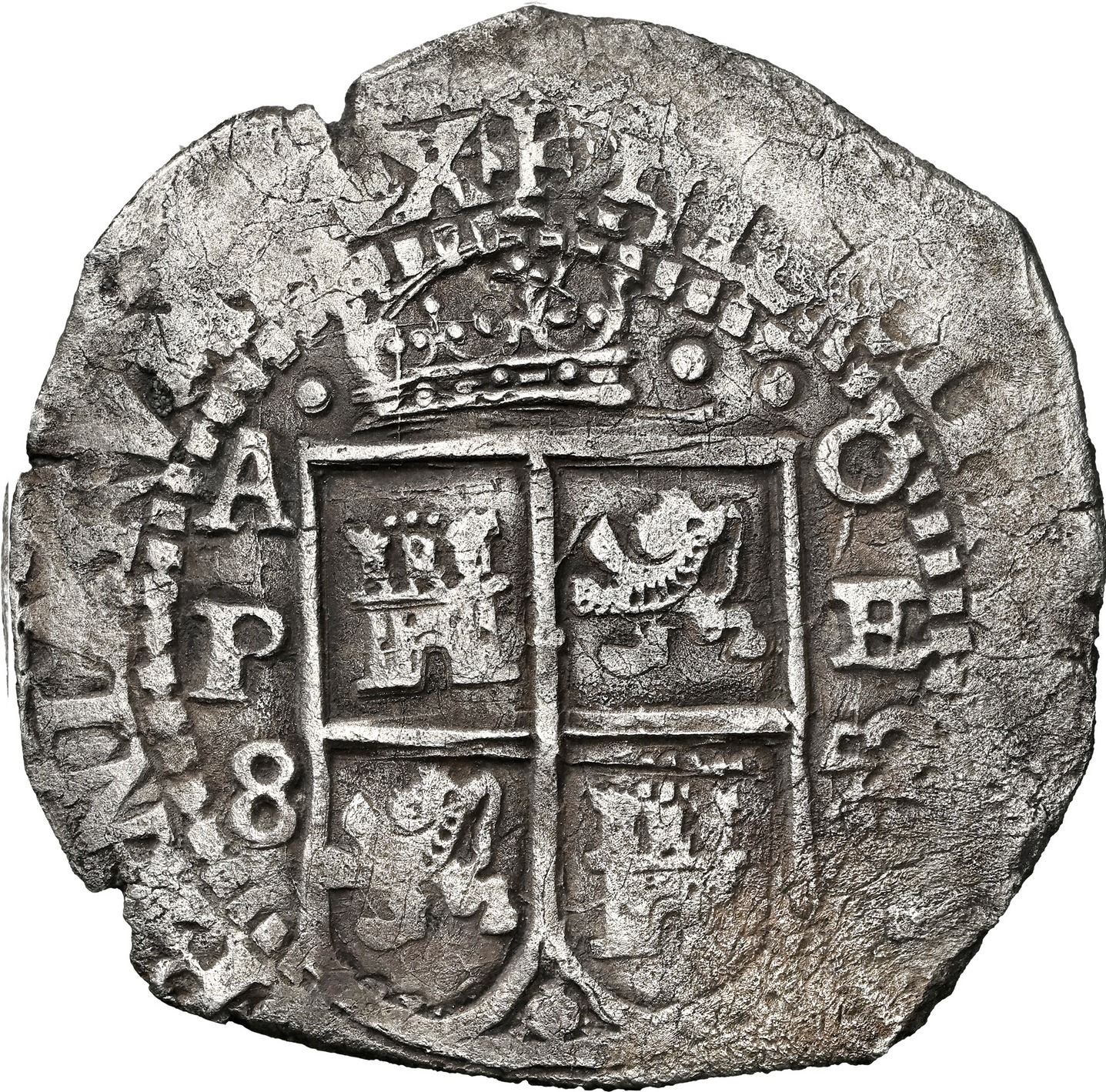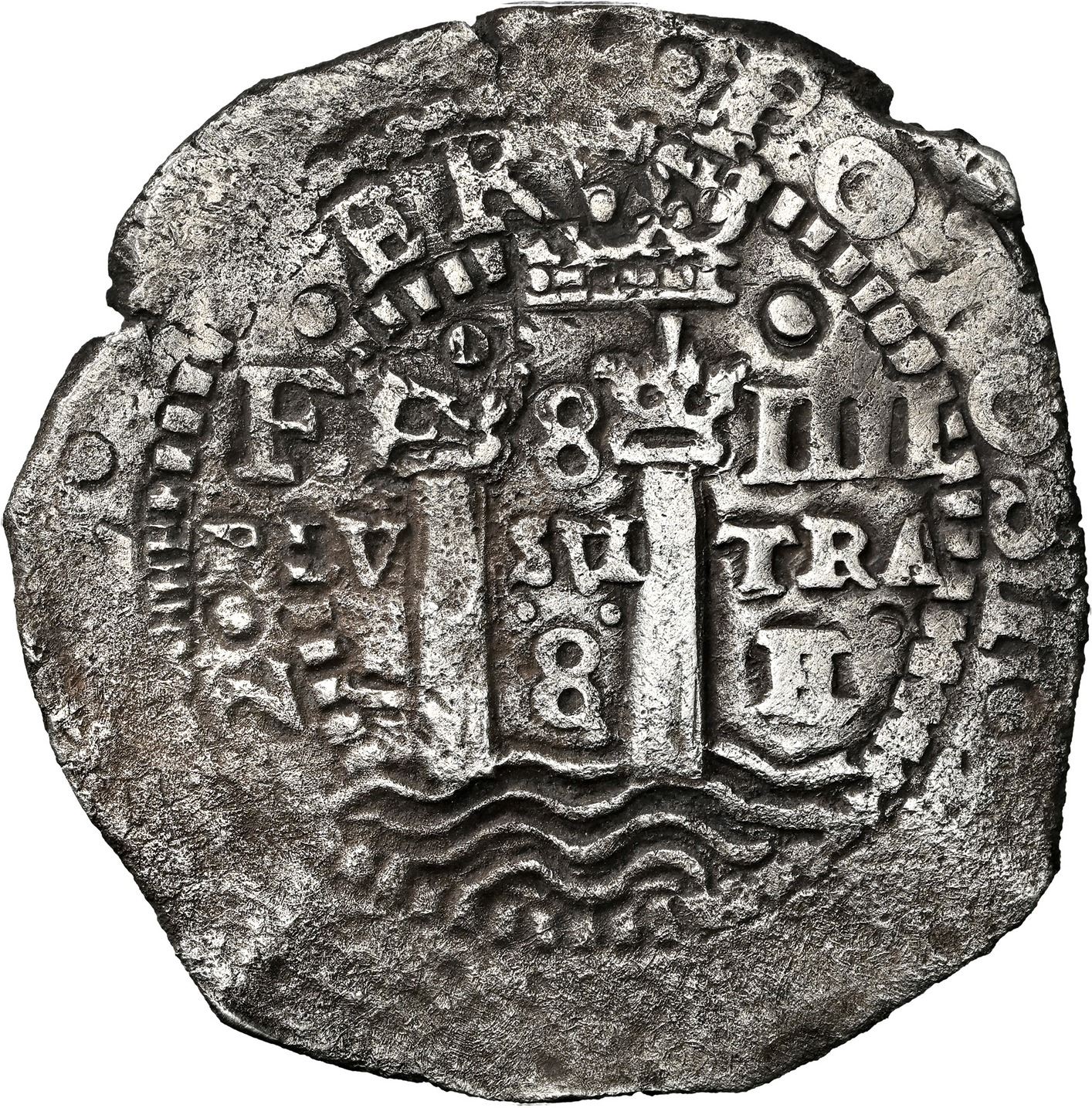 BOLIVIA, Potosí, cob 8 reales, 1652 E, Transitional Type IV/A, NGC XF details / saltwater damage (Shipwreck Blue Label), ex-Zbar. S-P37; KM-A20.4; Cal-1493. 24.04 grams. Full but doubled pillars-and-waves, choice full shield with complete crown above, A-P-8 to left, and O-E-52 to right, very light surface corrosion, contrastingly toned, Mastalir IV.1-A.da for subtype. Pedigreed to the Jack Zbar Collection (stated on label). Recovered from: Maravillas, sunk in 1656 off Grand Bahama Island