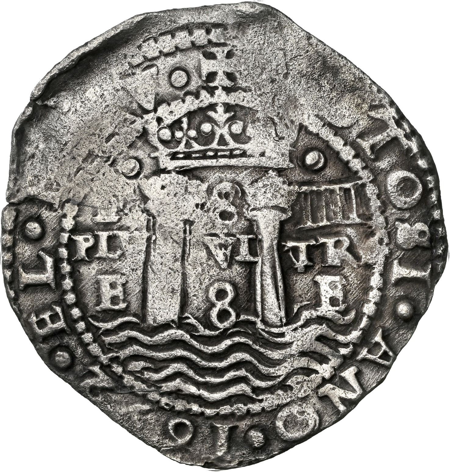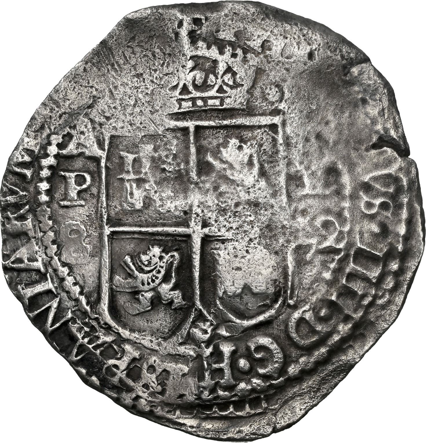 BOLIVIA, Potosí, cob 8 reales, 1652 E, Transitional Type IV/A, T/V in TRA of motto, NGC XF details / saltwater damage (Shipwreck Blue Label), ex-Zbar. S-P37; KM-A20.4; Cal-1493. 24.17 grams. Bold details enhanced by contrasting toning, with full inner details and lots of legend including 1652 date and king's ordinal IIII, some flatness and minor surface corrosion, Mastalir IV.1-A.aa for subtype with sub-variety T/V also listed. Pedigreed to the Jack Zbar Collection (stated on label). Recovered from: Maravillas, sunk in 1656 off Grand Bahama Island