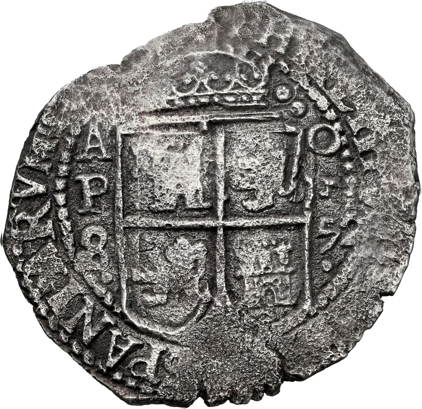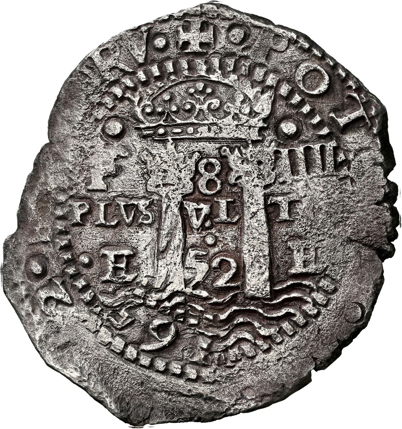 BOLIVIA, Potosí, cob 8 reales, 1652 E, Transitional Type V/A, motto as PLVS-VL-TRA, NGC AU details / saltwater damage (Shipwreck Blue Label), ex-Zbar. S-P37; KM-A20.5; Cal-1494. 22.49 grams. Full and well-centered shield, full pillars-and-waves with 1652 date from legend bold but doubled (both other dates also visible), corroded on edge, toned in crevices, Mastalir V.2-A.af for subtype. Pedigreed to the Jack Zbar Collection (stated on label). Recovered from: Maravillas, sunk in 1656 off Grand Bahama Island