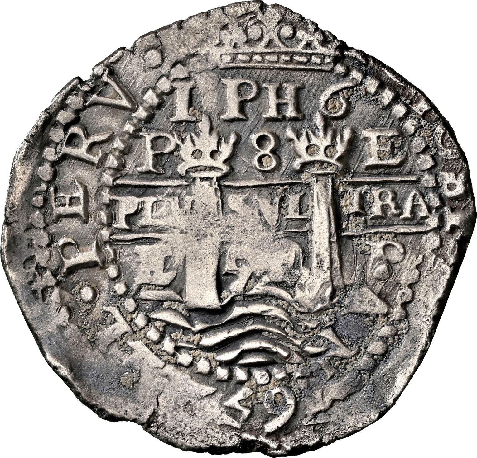 BOLIVIA, Potosí, cob 8 reales, 1652 E, Transitional Type VIII/A, NGC AU details / saltwater damage (Shipwreck Blue Label), ex-Zbar. S-P37; KM-A20.8; Cal-1495. 26.11 grams. Broad flan with full pillars-and-waves displaying second date below due to doubled legend, off-center shield with third date to right, mostly toned, minimal corrosion, Mastalir VIII.a-A for subtype (interesting muling of final pillars side with early transitional shield). Pedigreed to the Jack Zbar Collection (stated on label). Recovered from: Maravillas, sunk in 1656 off Grand Bahama Island