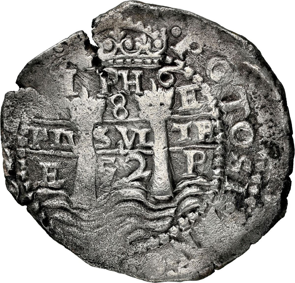 BOLIVIA, Potosí, cob 8 reales, 1652 E, post-transitional (Transitional Type VIII/B), 1-PH-6 at top, NGC XF details / sea salvaged (Shipwreck Blue Label), ex-Zbar. S-P37a; KM-21; Cal-1500. 25.71 grams. Broad flan with beautifully detailed full cross-lions-castles with 652 date below, full but slightly off-center pillars-and-waves (Mastalir VIII.1-B.aa.x for exact variety) with full POTOSI in legend and second date above waves, minimal corrosion, uneven light toning. Pedigreed to the Jack Zbar Collection (stated on label), with his tag. Recovered from: Maravillas, sunk in 1656 off Grand Bahama Island