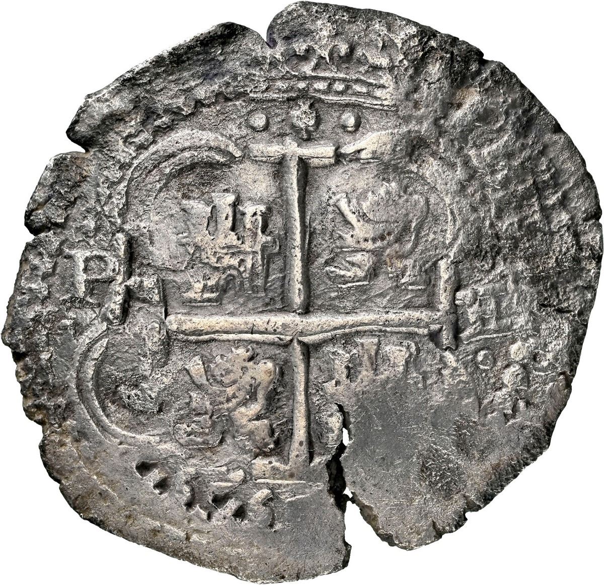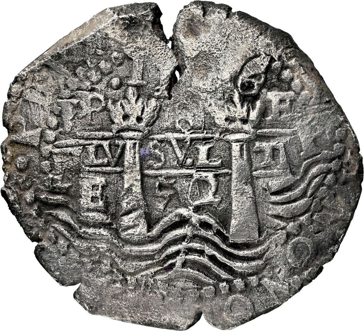 BOLIVIA, Potosí, cob 8 reales, 1652 E, post-transitional (Transitional Type VIII/B), 1-PH-6 at top, NGC XF details / sea salvaged (Shipwreck Blue Label), ex-Zbar. S-P37a; KM-21; Cal-1500. 24.57 grams. Well-centered strike with full pillars-and-waves (Mastalir VIII.1-B.da.x), full cross with 652 date below, light corrosion (mostly around edge), edge-crack, toned in crevices. Pedigreed to the Jack Zbar Collection (stated on label). Recovered from: Maravillas, sunk in 1656 off Grand Bahama Island