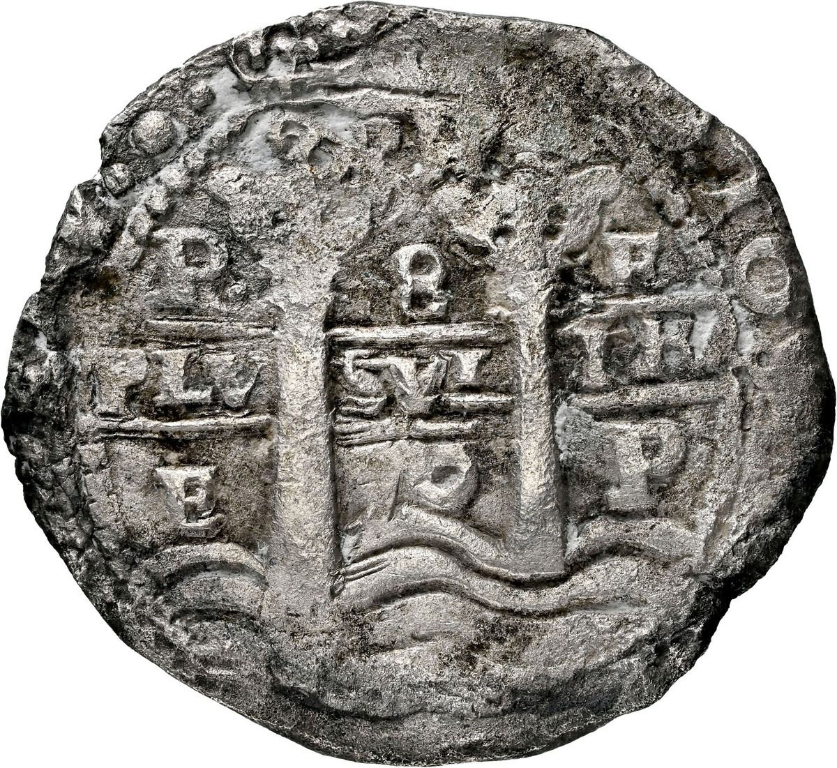 BOLIVIA, Potosí, cob 8 reales, 1653 E, PH at top, •pomegranate• above cross, NGC XF details / sea salvaged (Shipwreck Blue Label), ex-Zbar. S-P37a; KM-21; Cal-1503. 23.78 grams. Bold full pillars-and-waves, full cross, light to moderate surface corrosion and spotty toning, exact Mastalir variety uncertain. Pedigreed to the Jack Zbar Collection (stated on label), with his tag. Recovered from: Maravillas, sunk in 1656 off Grand Bahama Island