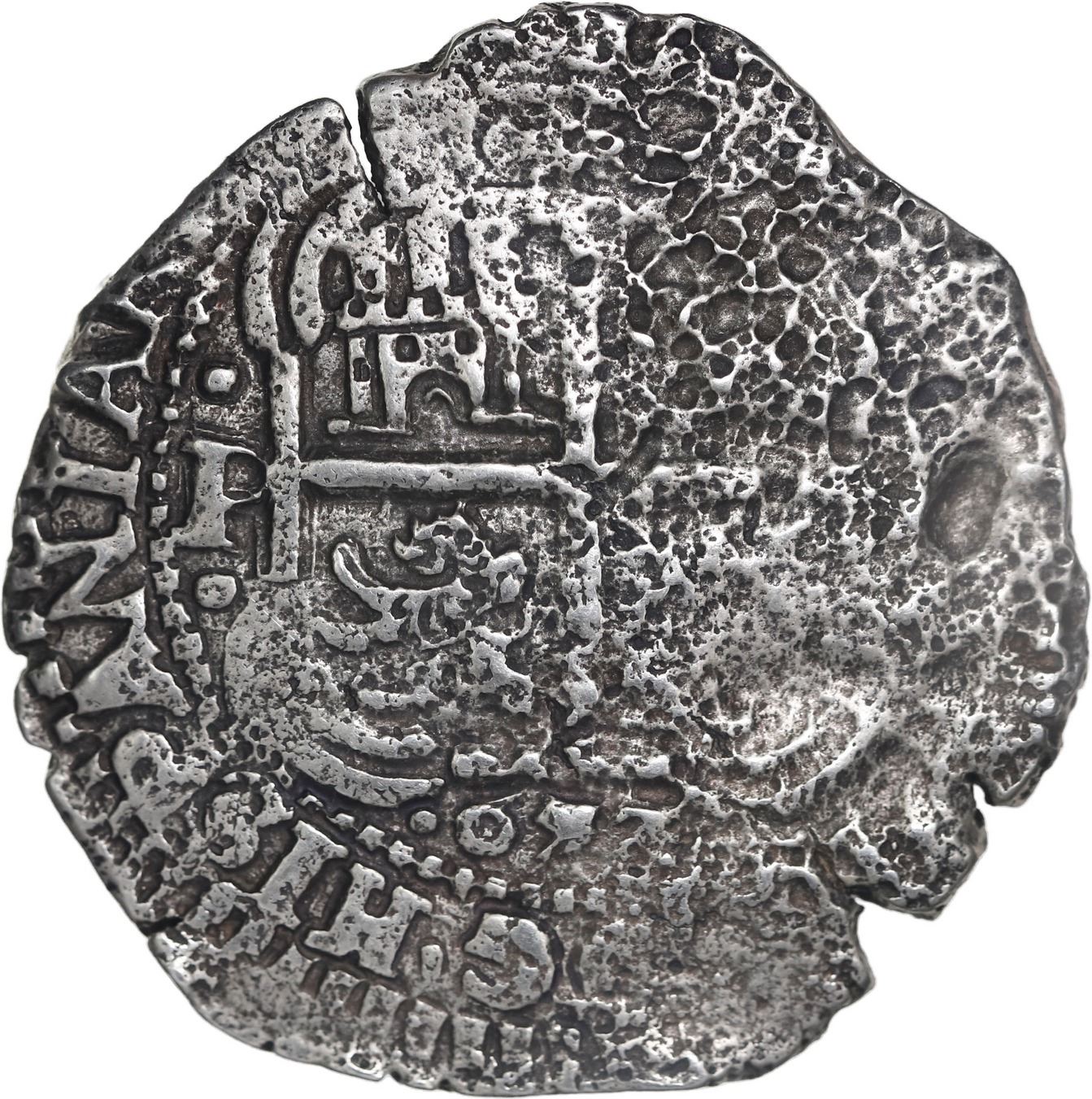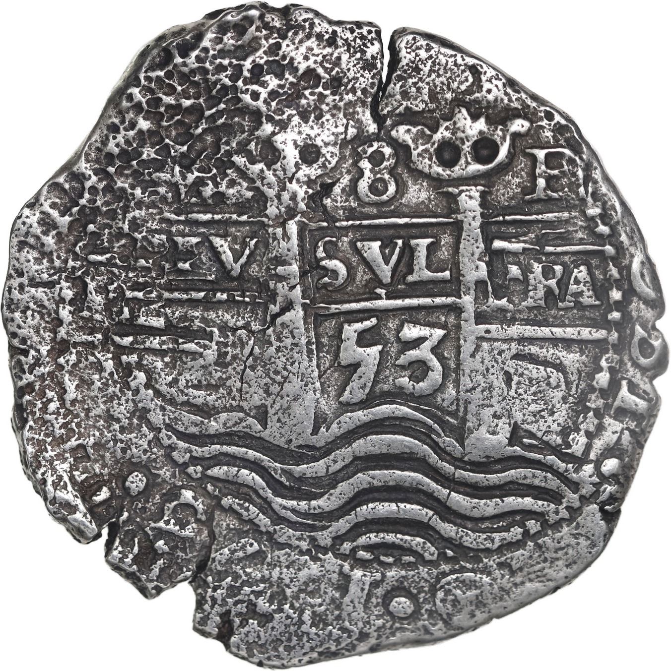 BOLIVIA, Potosí, cob 8 reales, 1653 E, •PH• at top, •pomegranate• above cross. S-P37a; KM-21; Cal-1503. 21.18 grams. Very nice piece despite corrosion with three full dates plus complete and bold pillars, partial cross with HISPANIA quite visible. Recovered from: Capitana, sunk in 1654 off Chanduy, Ecuador