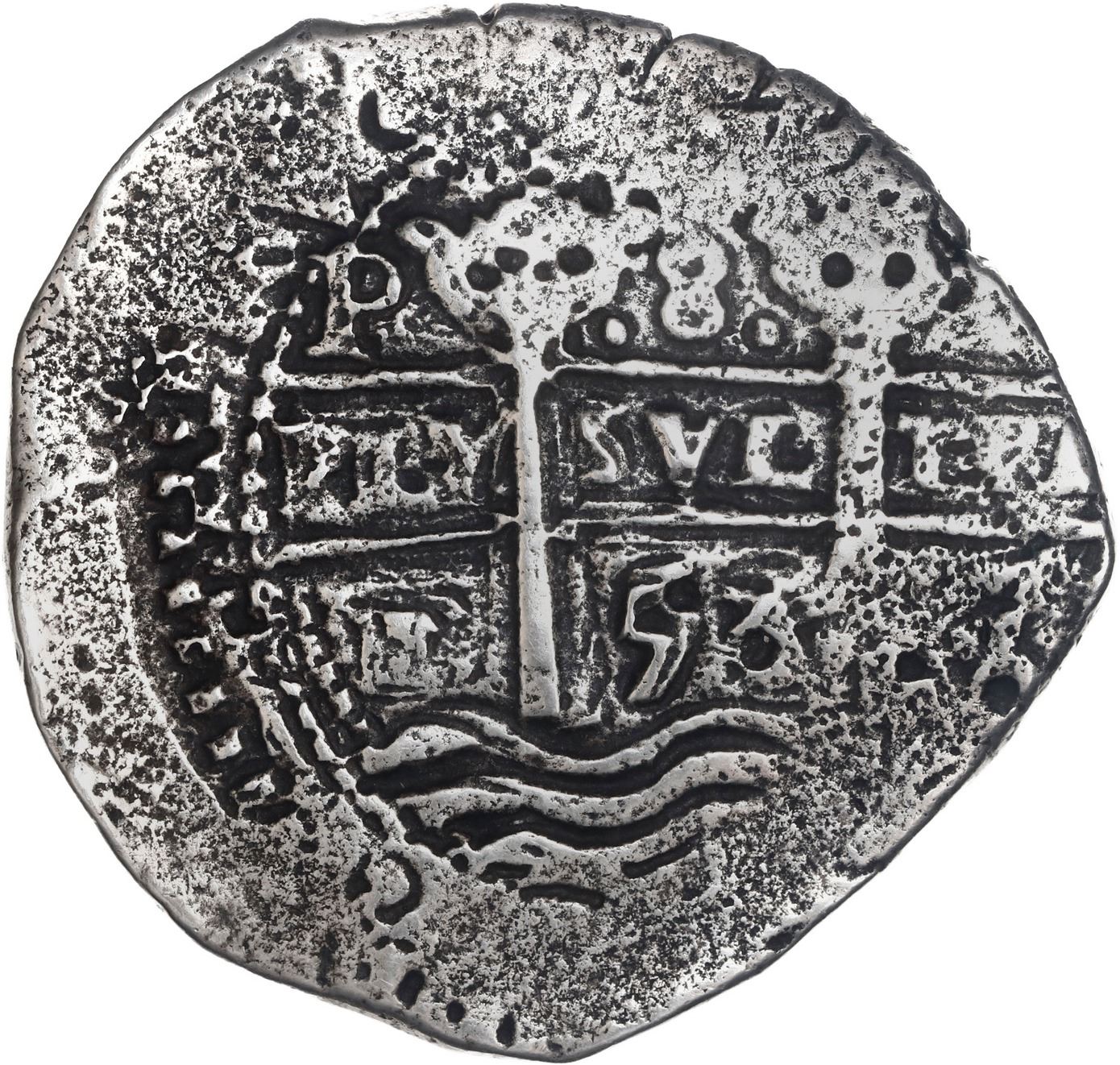BOLIVIA, Potosí, cob 8 reales, 1653 E, •PH• at top, •pomegranate• above cross. S-P37a; KM-21; Cal-1503. 22.79 grams. Choice full cross-lions-castles, full but off-center pillars-and-waves, two dates and assayers and mintmarks, light surface corrosion, contrastingly toned. Recovered from: Capitana, sunk in 1654 off Chanduy, Ecuador