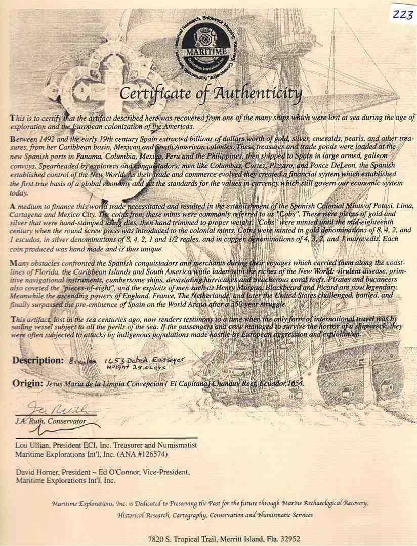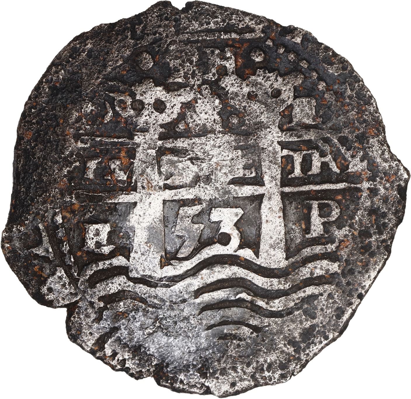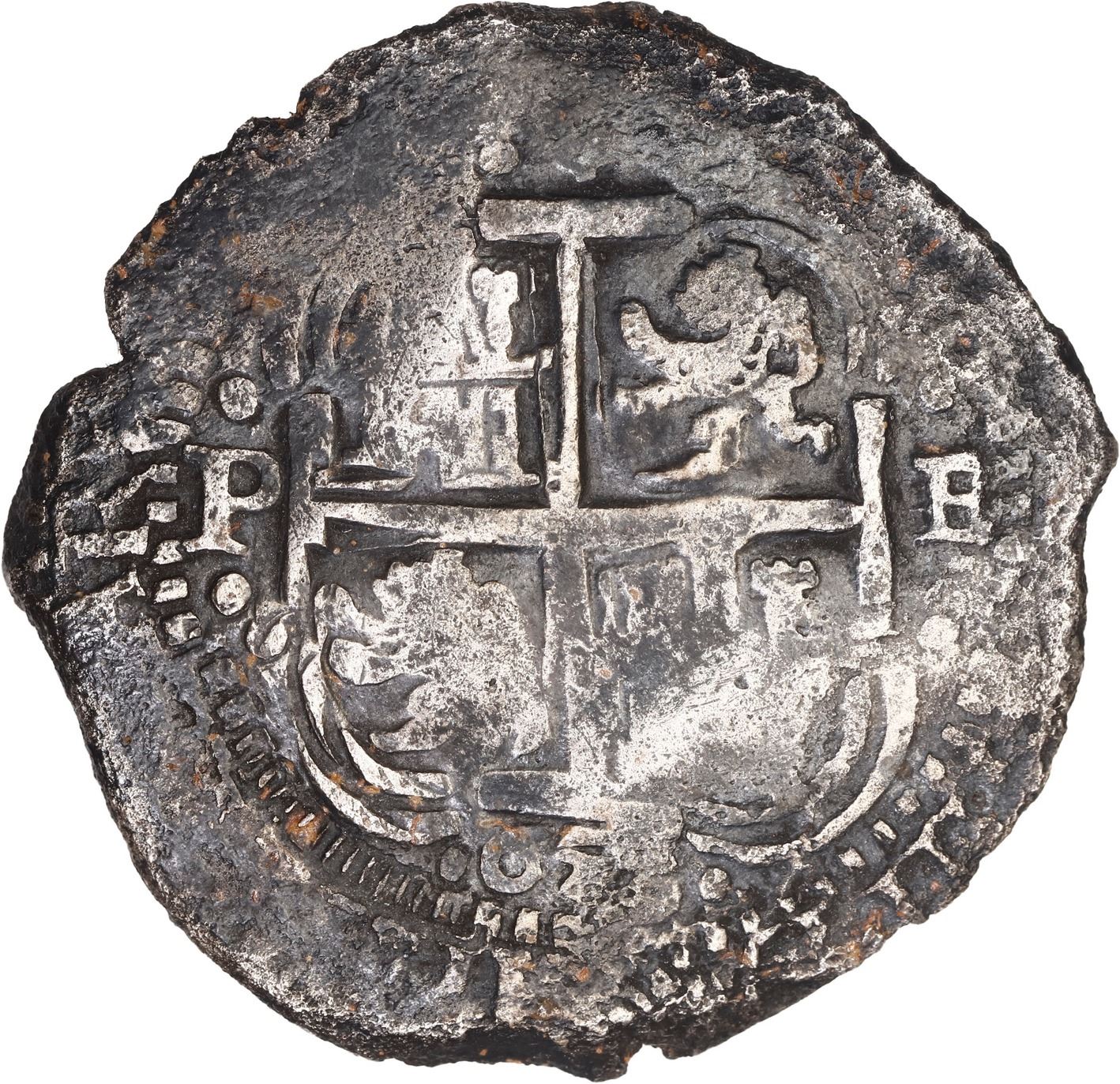BOLIVIA, Potosí, cob 8 reales, 1653 E, •PH• at top, •pomegranate• above cross, Mastalir Plate. S-P37a; KM-21; Cal-1503. 25.03 grams. Full and well-centered pillars-and-waves and cross-lions-castles, uneven dark toning with hints of orange, corroded around edge. With original tag and certificate from the salvors, also Plate Coin for variety II-bc.y2 on page 41 of Robert Mastalir's The Great Transitional at the Potosí Mint 1649-1653, The Post-Transitional Coinage of 1653-1659 (2023), with his tag. Recovered from: Capitana, sunk in 1654 off Chanduy, Ecuador