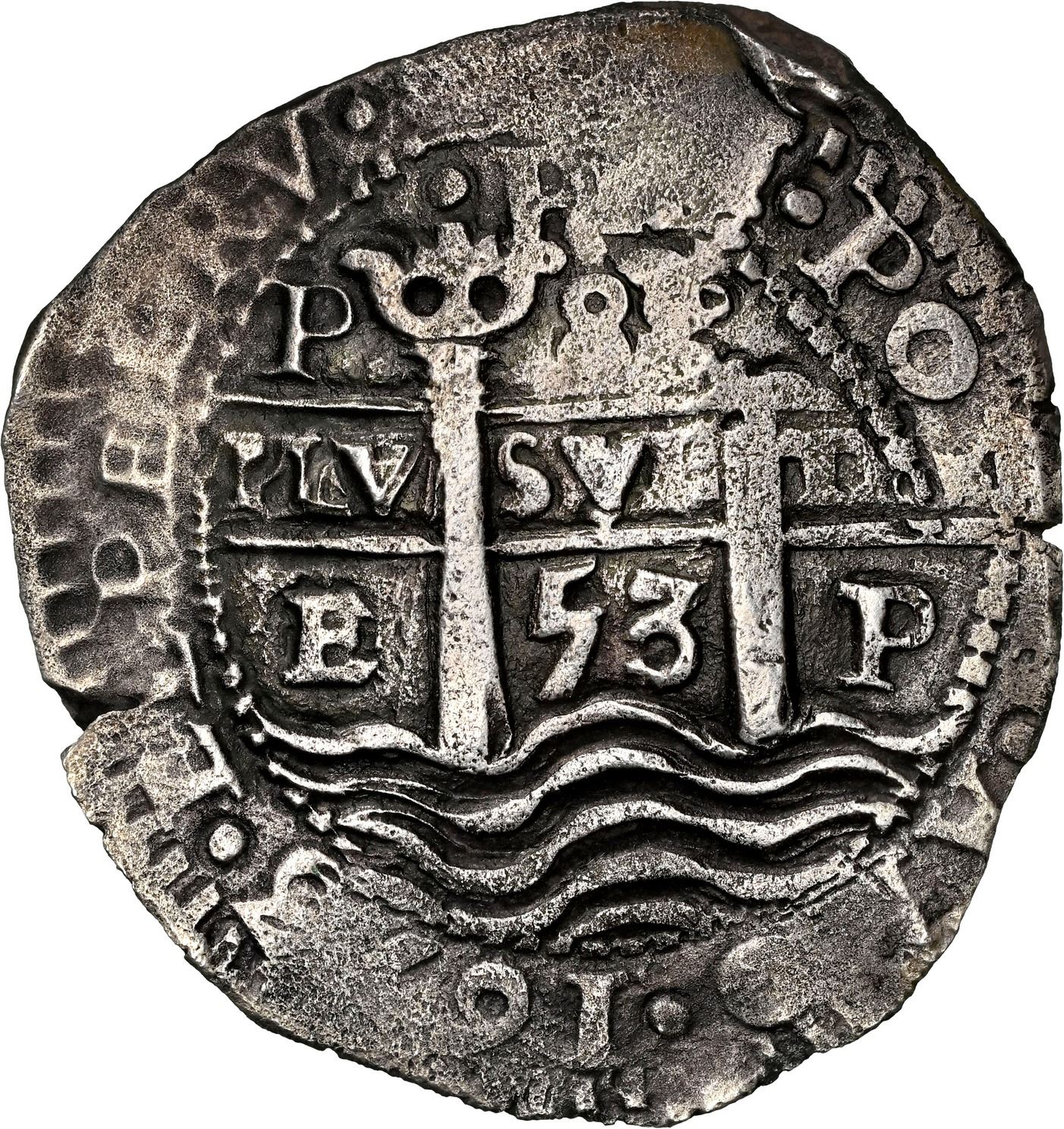 BOLIVIA, Potosí, cob 8 reales, 1653 E, •PH• at top, •pomegranate[x=#8226/